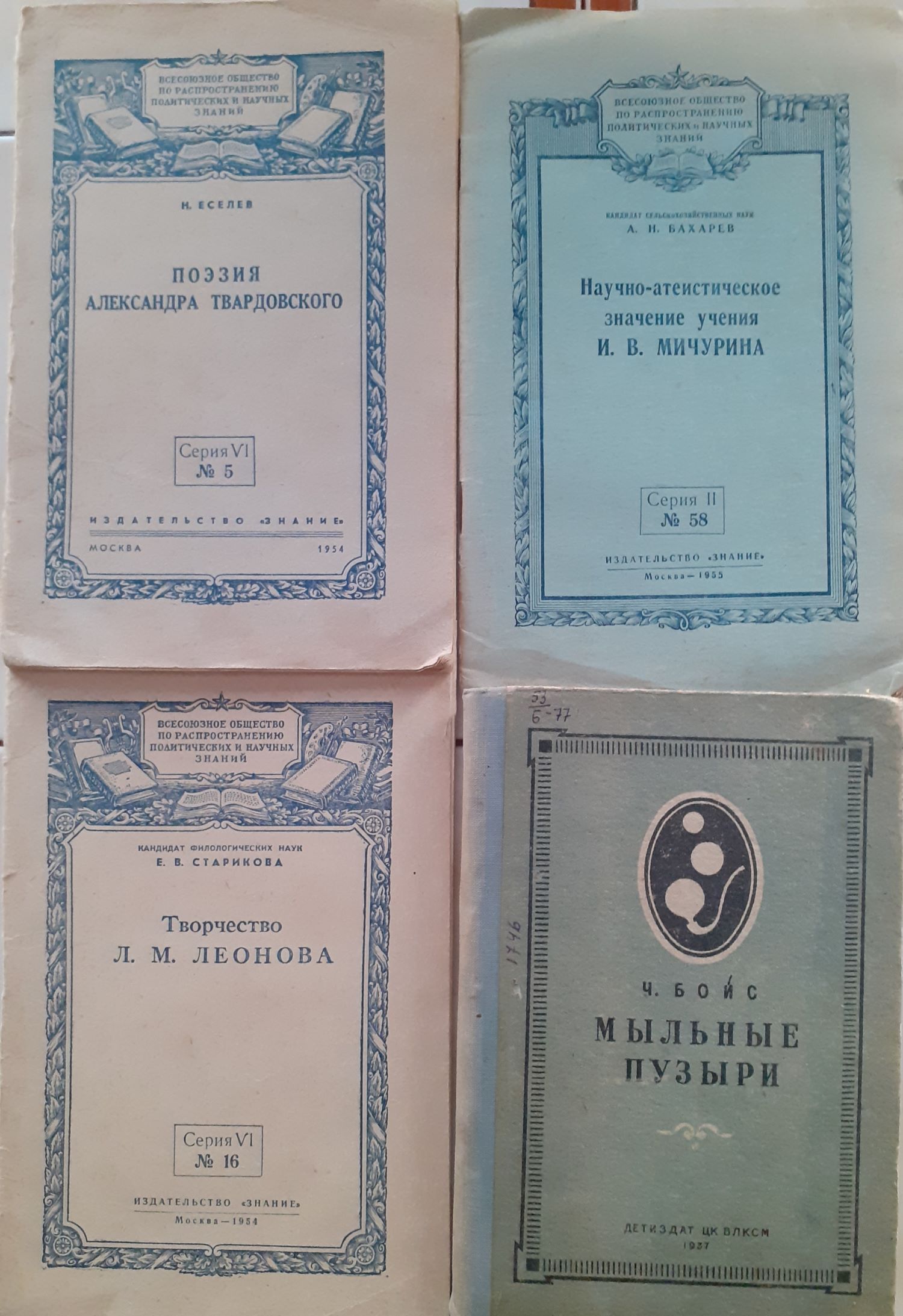 Н. Еселев. Поэзия А. Твардовского. 1954 г. 32 с. Обложка. Штамп. Е.В. Старикова. Творчество А.М. Леонова. 1954 г. 32 с. Обложка. Штамп. А.Н. Бахарев. Научно-атеистическое значение учения И.В. Мичурина.1955 г. 24 с. Обложка. Штамп. Ч. Бойс. Мыльные пузыри. 1937 г. 126 с. Твердый переплет. Штамп. Стоимость любой 100 рублей. Вложенные эскизы изображений |