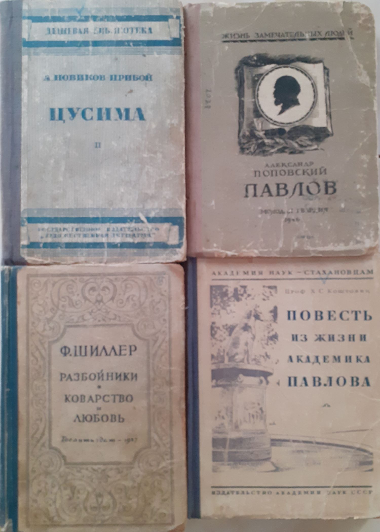А. Новиков-Прибой. Цусима. Кн. 2. 1935 г. 362 с. Твердый переплет. Уменьшенный формат. Штамп. Р. Шиллер. Разбойники. Коварство и любовь. 1937 г. 304 с. Твердый переплет. Уменьшенный формат. Штамп. А. Поповский. Павлов. 1946 г. 254 с. Твердый переплет. Уменьшенный формат. Штамп. Х.С. Хоштоянц. Повесть из жизни академика Павлова. 1938 г. 144 с. Твердый переплет. Уменьшенный формат. Штамп. Стоимость 100 рублей каждой. Вложенные эскизы изображений |
