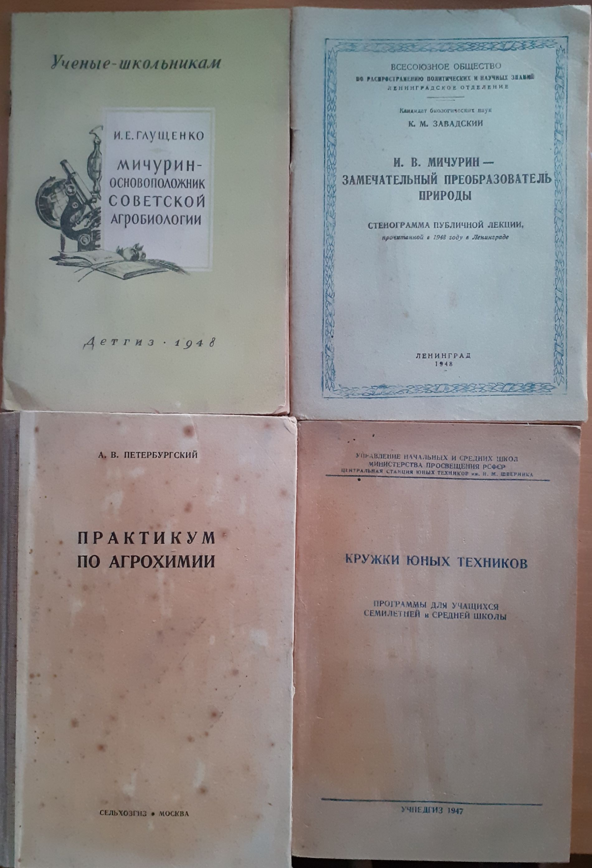 К. Завадский. И.В. Мичурин – замечательный преобразователь природы. 1948 г. Обложка. 14х19,5 см. 36 с. Загрязнение и повреждение обложки. Штамп. И. Глущенко. Мичурин – основоположник советской агробиологии. 1948 г. Обложка. 13,5х19,5 см. 48 с. Штамп. Кружки юных техников. 1947 г. Обложка. 13х20 см. 126 с. Повреждение обложки. Штамп. А. Петербургский. Практикум по агрохимии. 1947 г. Твердый переплет. 13,5х20,5 см. 280 с. Штамп. Стоимость 100 рублей любая. Вложенные эскизы изображений |