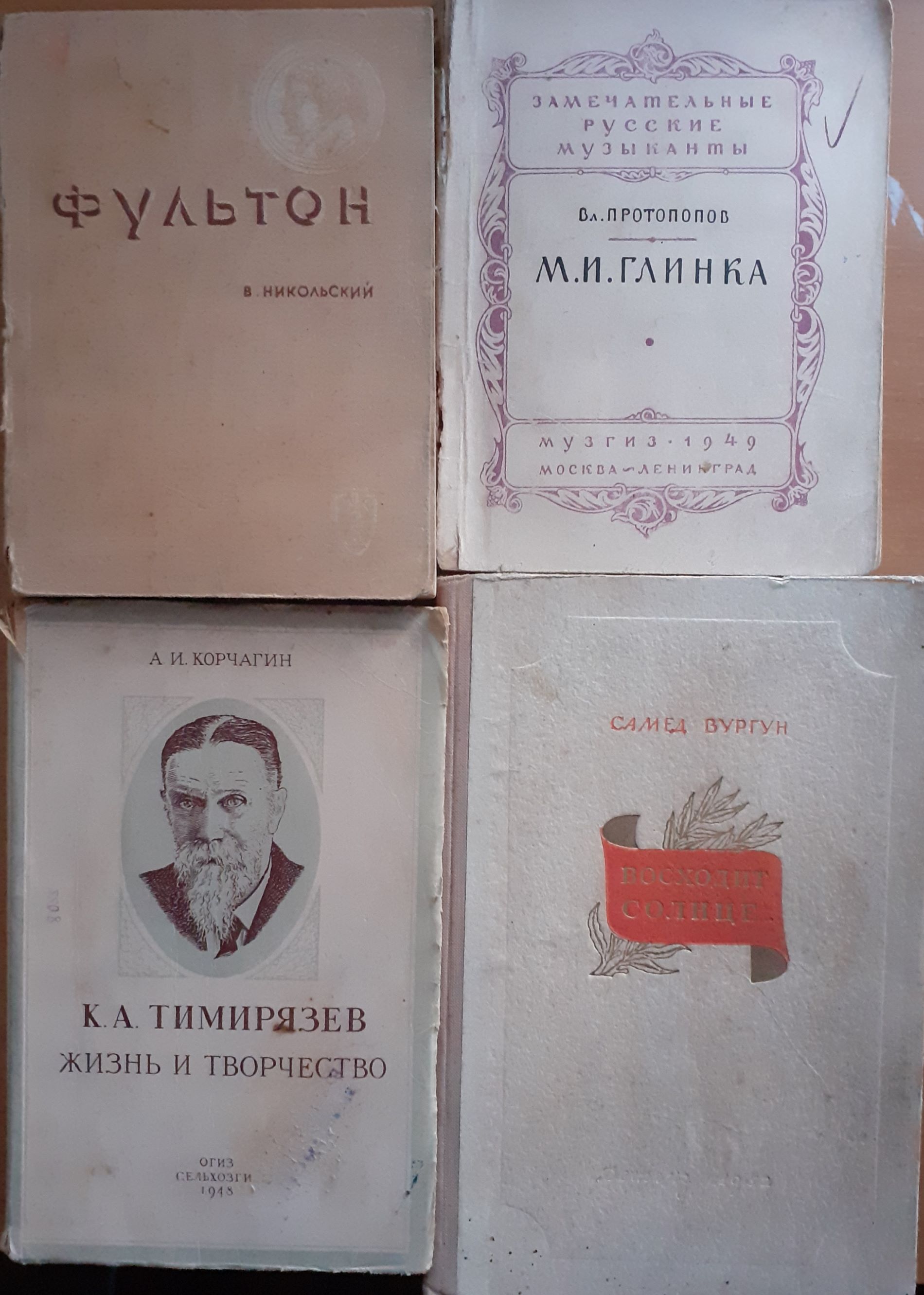 В. Никольский. Фультон. 1937 г. Обложка. 12,5х17 см. 284 с. Повреждение обложки. Штамп. В. Протопопов. Глинка. 1949 г. Обложка. 13х17 см. 72 с. Повреждение обложки. Штамп. А. Корчагин. К.А. Тимирязев. 1948 г. Обложка. 13х20 см. 158 с. Повреждение обложки. Штамп. С. Варгун. Восходит солнце. 1952 г. Твердый переплет. 15х22,5 см. 88 с. Штамп. Стоимость 100 рублей любая. Вложенные эскизы изображений |