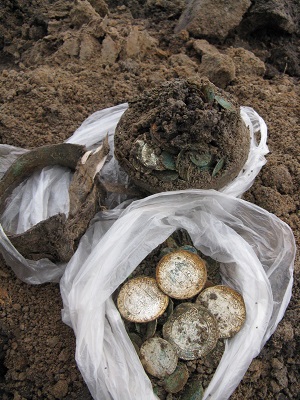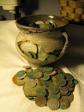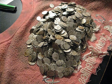 Но история не об этом. В общем пошёл я на окраину села. Село на берегу реки и раньше река была широка, но в советское время произвели осушение, соответственно теперь река шириной в рукотворный канал. А в старое время через реку были пантонные переправы. Соответственно в самом селе было много мест откуда они стартовали. Как пример, на двух огородах мне удалось найти более 200-х монет. Ну так вот, весна выдалась ранняя, поэтому уже в начале марта я в полях. Снег ещё не сошёл, а уже летишь на всех парах. Так и здесь, второй мой выход в том сезоне, на 7 марта. Пошёл я обследовать те огородики в конце села. Хожу-брожу. Изредка попадаются одиночные находки ранних советов или мелкого царизма. И вот с очередным взмахом звучит чёткий цветной сигнал. А ходил я тогда с аськой 250-й и катушкой Nel Big. Сигнал громкий. Ну, думаю, опять алюминиевая консервная банка. Воткнул лопату на всю длину и давай поддевать грунт. Слышу в что-то упёрлось и послышался хруст. Я уже к этому времени привык ко всему, поскольку даже в этом селе копал лопаты, вёдра, казанки на глубине до полуметра. Ну, думаю, ладно, обкопаю. Всё равно, если предмет большой, то придётся обкапывать. Немного снял сверху, расширился. Тут снова снимаю из цента грунт и вижу внизу что-то зелёное в перемешку с блестящим. Опять же без задней мысли (поскольку в такое чудо не вериться пока не возьмёшь в руки) начинаю присматриваться и вижу очертания монет. И ИХ МНОГО!!! И ОНИ В ГОРШКЕ!!! И тут до меня доходит о произошедшем. Кричать от радости в селе не будешь, поэтому немного потанцевал рядом и давай всё это дело вынимать. Благо всё было в кубышке и ничего не высыпалось. Верхний край кубышки был на глубине 35 см. А там пахали только МТЗ, поэтому он и остался целым. Аккуратненько я обкопал эту кубышечку, достал её и сразу положил в кулёчек (что-бы ничего не выпало по дороге), а потом уже и в сумку. И поехал домой, поскольку хотелось всё увидеть поближе. Дома уже разобрал его и систематизировал. Общий временной период спрятанного был порядка 100 лет. Присутствовало очень много монет из разных стран. Общий вес более трёх кг серебра. И никакой меди. Более подробно видно на видео. https://www.youtube.com/watch?v=kWBOmYW50sQ...%80%D0%B8%D0%B8 Конечно же это мои мечтания и всё не реально. Вложенные эскизы изображений |
