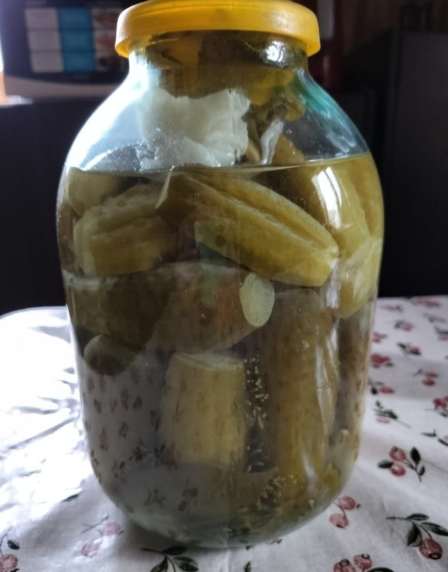 получаются как раньше бочковые на рынке идешь бывало, вокруг запах свежей зелени, горки яблок, черешня, аромат клубники... и огурчики соленые купишь один ( а когда был маленький и бесплатно давали ) и идешь... хрумкаешь... итак огурцы берем любые, которые годятся для засолки, не салатные и желательно не полосатые ( они как правило толстенькие ) обычные грунтовые, пупырчатые... на 3-х литровую банку : кладем вниз, на дно укроп, зонтики - 3-4 шт смородина - 3-4 листика вишня - 2-3 листика перец черный - 5 горошин чеснок-3-4 зубчика у огурцов чуть отрезаем попки ( не накалываем, как при изготовлении малосолов ) . укладываем в банки огурцы, желательно максимально и вертикально сверху можно, даже желательно положить листик хрена или ложечку сухой горчицы в марлю заворачиваем 100 гр соли и запихиваем в банку сверху залить холодной ключевой водой и закрыть очень плотной пластиковой крышкой ( что бы она там не болталась и не крутилась ) банку ставим в прохладное место все рассол получается не прозрачный, бело-мутный, но очень вкусный годится как для опохмела, так и просто хлопнуть полстаканчика мне нравится открытая банка из которой вытащили остатки марли и несколько огурчиков опчять закрывается этой же самой крышкой и ставится в то же прохладное место как минимум месяц ничего с огурцами не произойдет годятся для винегретов, рассольников, прочих салатов и блюд ну и так просто хрумтеть, можно под водочку или самогоночку вода реально должна быть ключевой очень хорошего качества сильно железистая, из колонки или из-под крана не подойдет на фото видно что немного рассола куда-то испарилось не знаю куда, банку закрывали еще в июле-начале августа может быть жена маленько не долила но на вкус и хруст никак не повлияет Сообщение отредактировано Barsoff: Mar 19 2024, 12:57 Вложенные эскизы изображений -------------------- Хамство, неуважение к другим участникам форума, переход на личности повлекут отстранение участника.