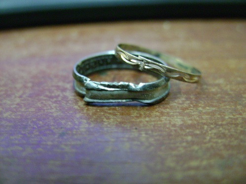 во, такое кольцо попалось, гнутое, без пробы, крупное, размер на мужика, но, вроде серебро.