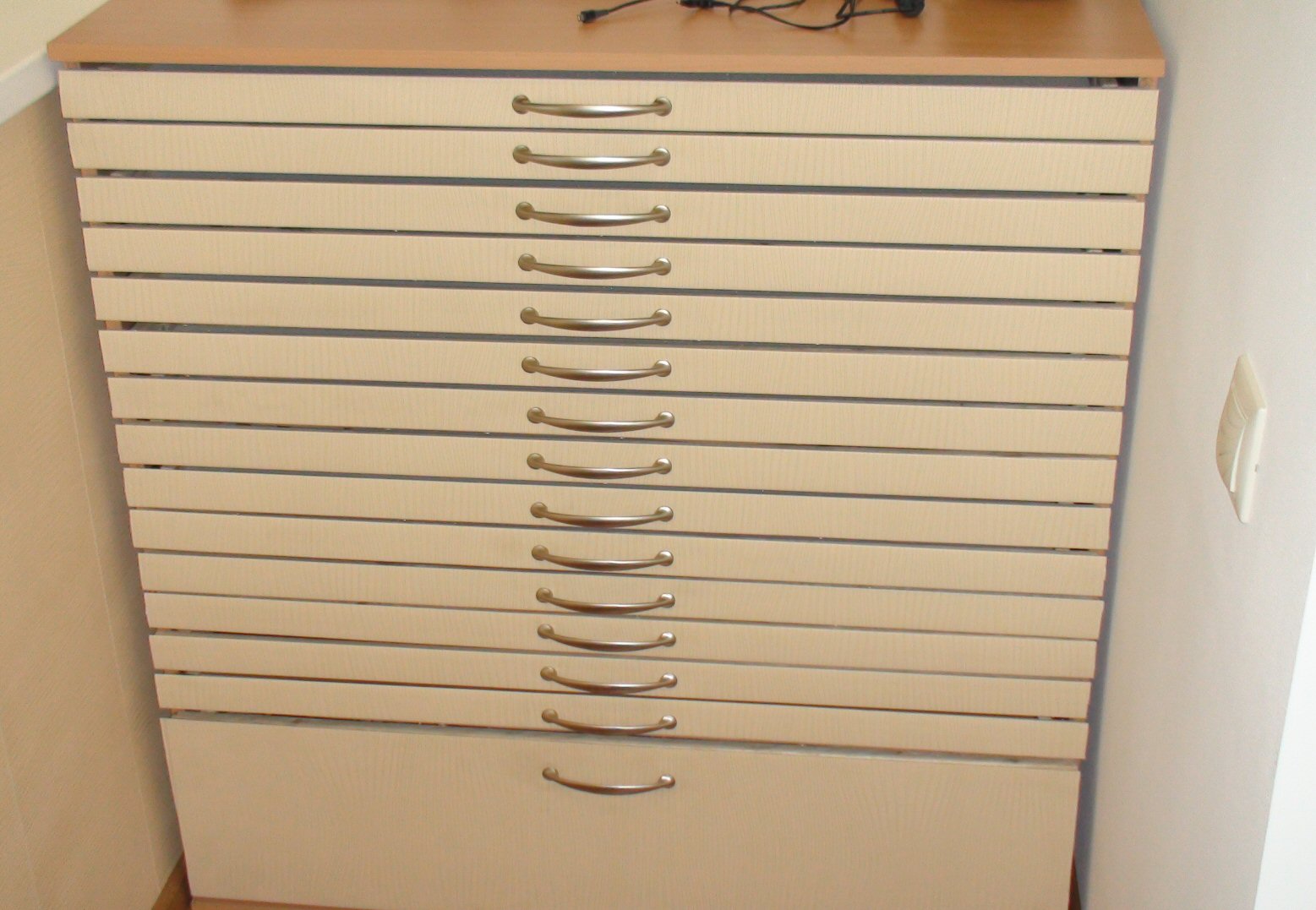 В тему последних сообщений. На отапливаемый балкон в квартире хотел заказать комодик с выдвижными ящиками. По размерам балкона ширина прим. 1 метр, высота тоже ок. метра. Наши мебельщики-барыги (спрашивал в разных местах) выкатили счет ок. 75 тыс. Мотивировали дороговизной фурнитуры. Решил сделать сам. Всю фурнитуру взял за 1500 руб. в Подмосковье на складе. Несколько дней в гараже и вот, что получилось. Сделал вставки из листов поролона, чтобы пластика не елозила.