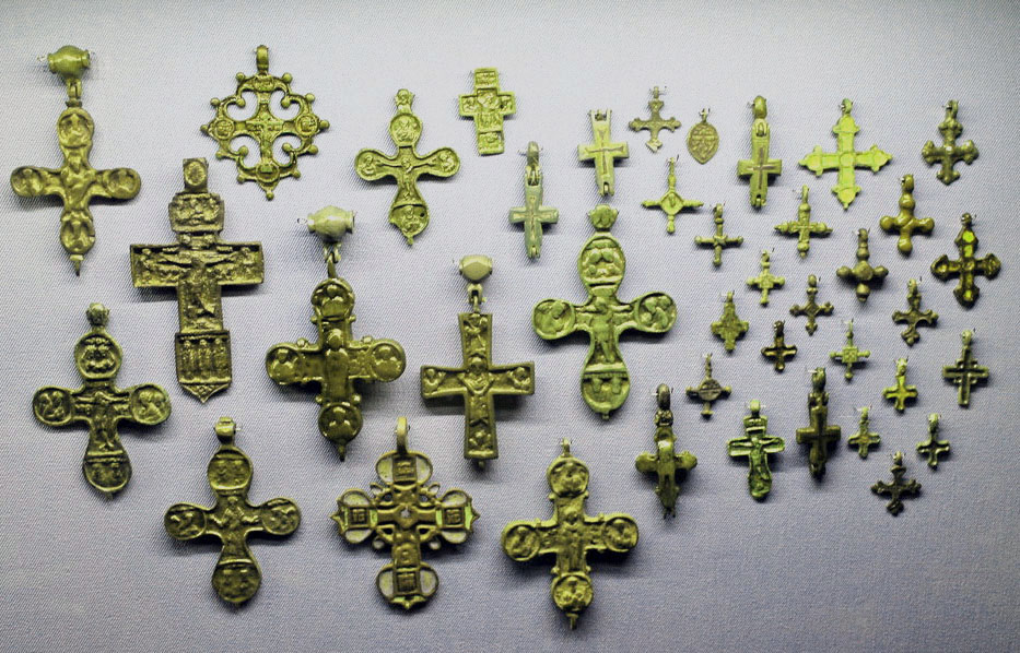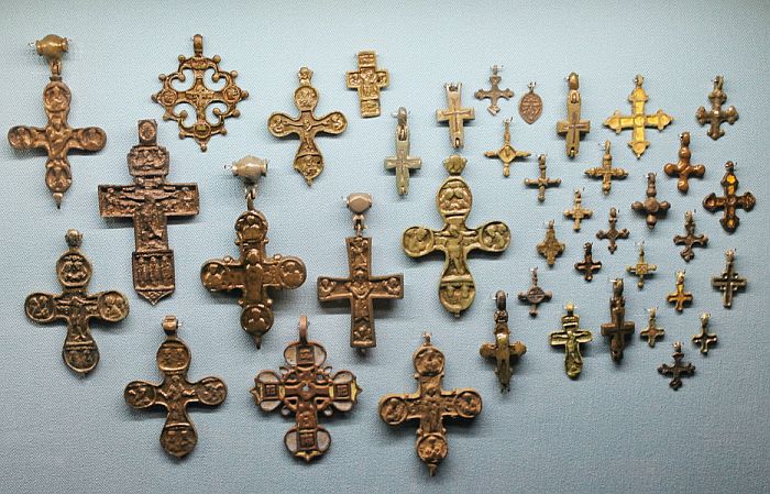 Ну, речь видимо о том, что привычной глазу древней патины на экспонатах не видно. Но это - хозяин-барин, хотя вот наперсник прямоконечный 16в., он, на мой взгляд, сильно отличается от остальных крестов именно глубиной раздевания. Но, опять же, неизвестно каким он пришел к хозяину. Может и не было другого выхода.