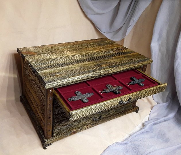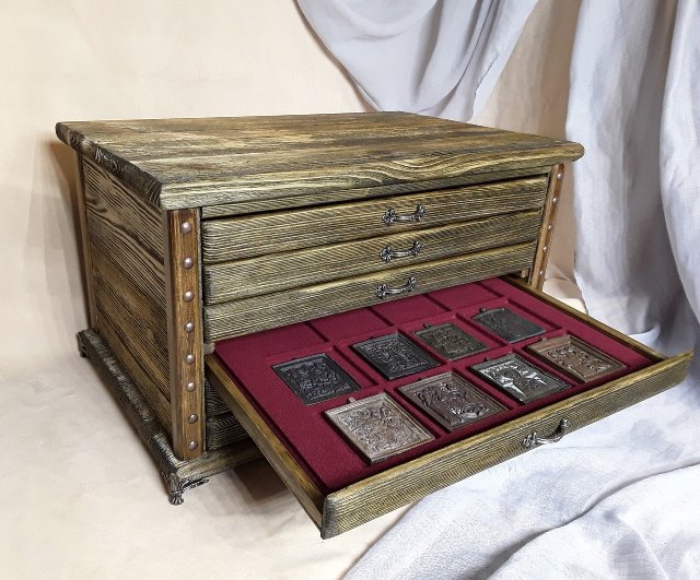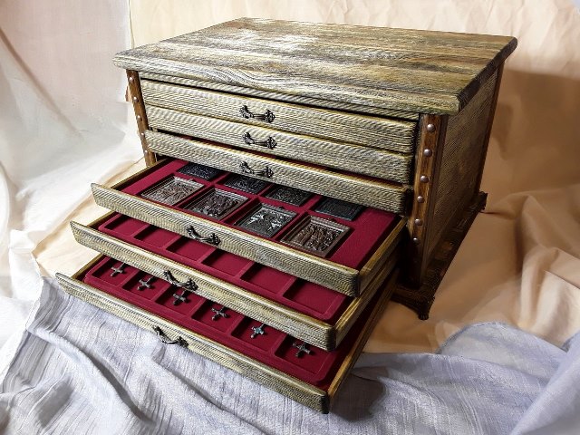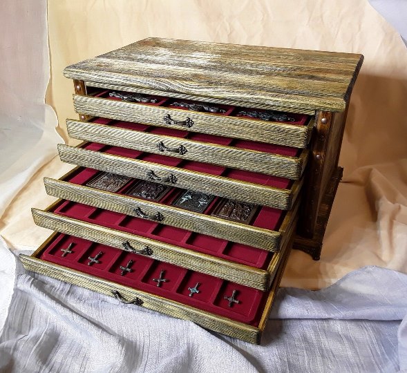 Доброго времени суток всем!!! Когда встал вопрос хранения (не в пакетиках) найденой пластики,сначала сделал стенд..Купил фоторамку со стеклом большого размера и уже использовав её,как дверцу,собрал под её размер короб...Ну а дальше дело техники ,как крепить...У меня на задней стенке пеноплен обтянутый холщиной...А тут как то решил попробовать смастерить минцкабинет.. Даже не себе,посоветовали друзья изготовить что нибудь ещё,кроме сундуков и шкатулок..))))Неделю провозился....Вот такая штука вышла!!!)