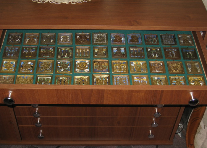 Внесу свои "5 копеек". Ранее я уже демонстрировал вам как храню свою металлопластику. Но она всё прибывает и прибывает И последний раз сделал вот что... Купил за 500 руб. старинный киот - ![]() ![]() Поменял в нем треснутое стекло, сделал полочки и покрасил внутреннюю часть морилкой под "родной" цвет. ![]() Повесил на стену и заполняю потихоньку Прикинул, что туда поместится не менее 40 вершковых икон. ![]() |