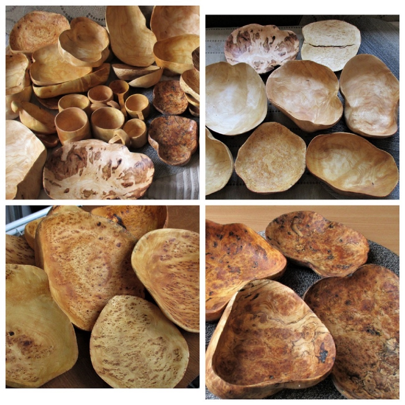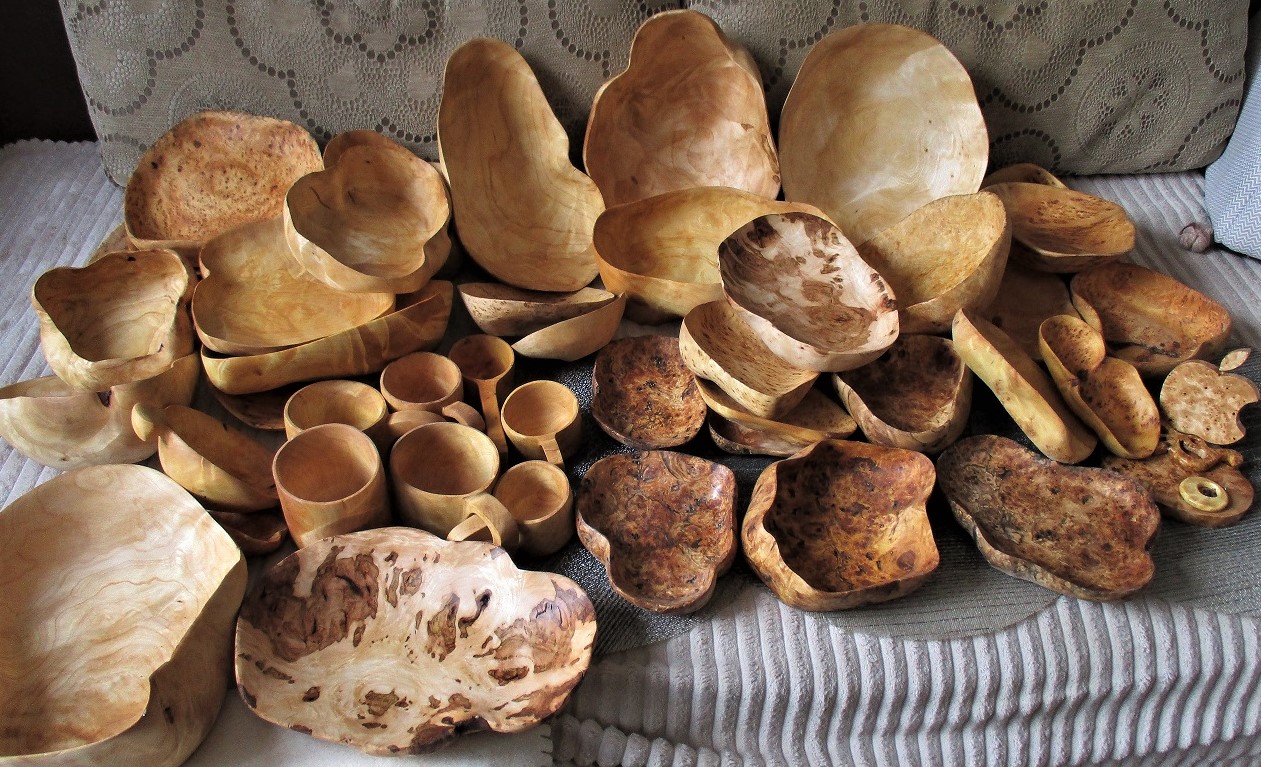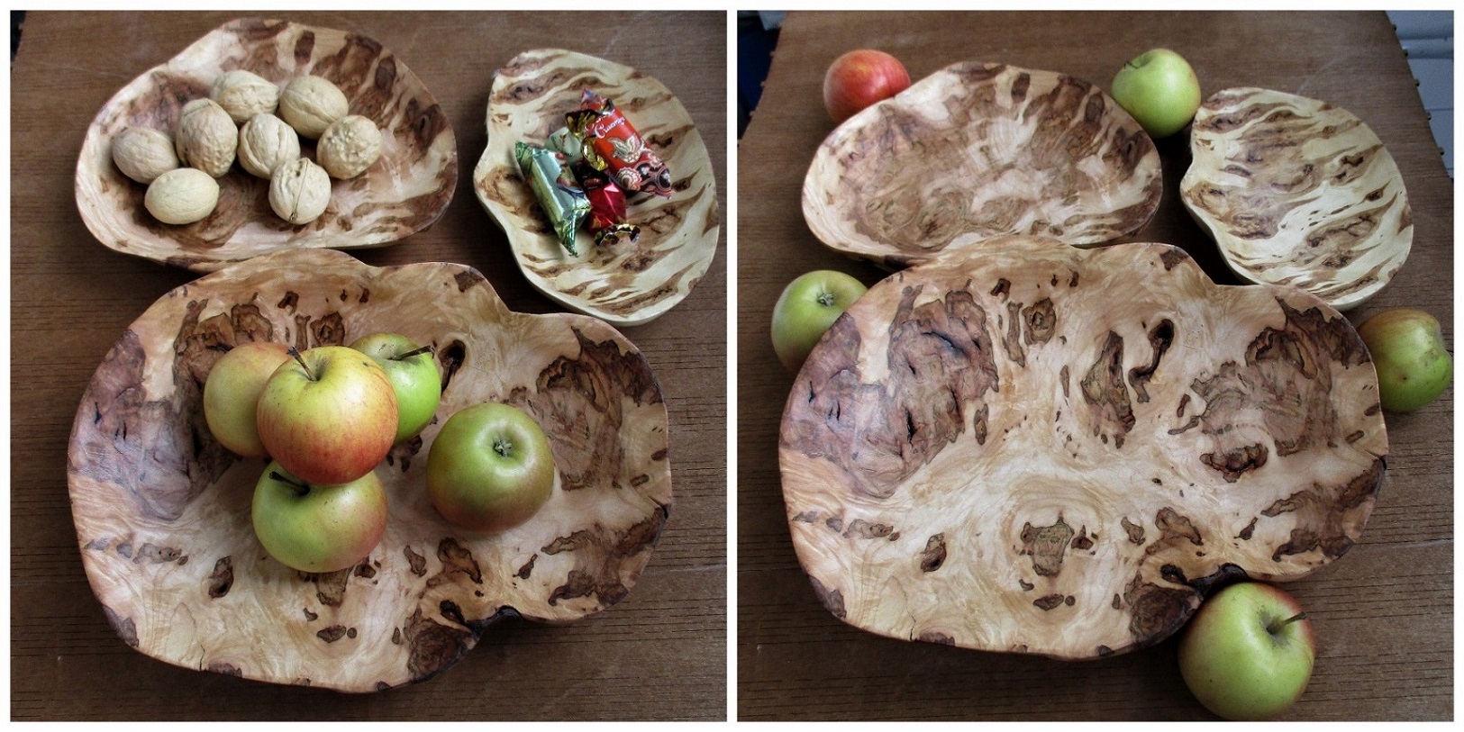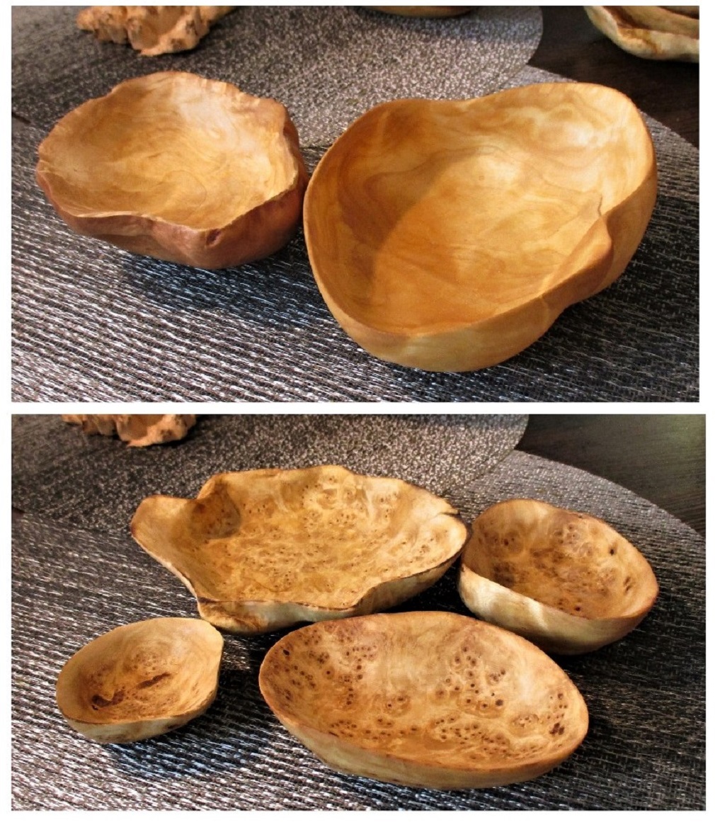 Особенно хороши большие блюда (чаши) размером около 30 см. Но такие сувели попадаются редко, а капа 30 см пока вообще не встречал. Конечно размер это уже очищенная от коры, заболони заготовка. По мне так большие блюда поистине украшение стола.