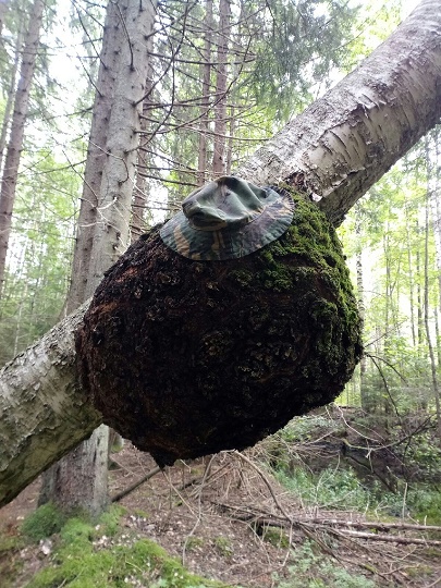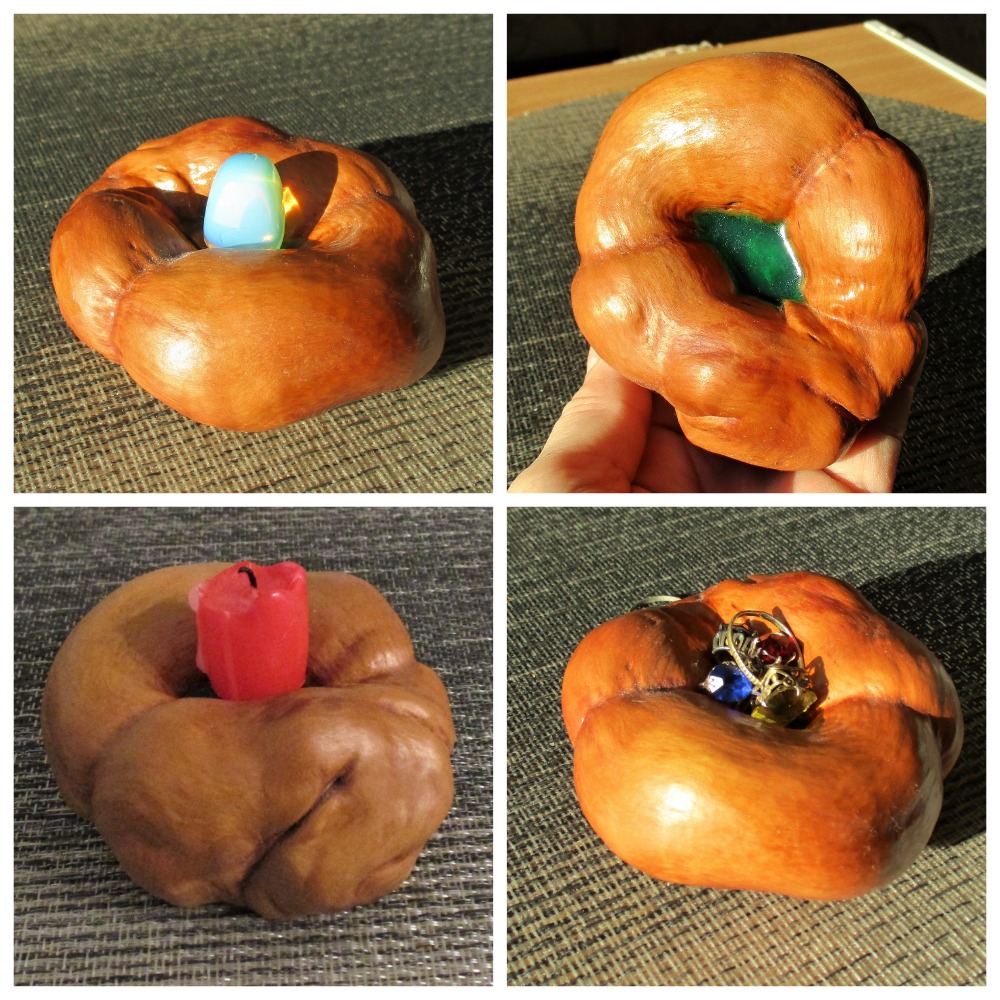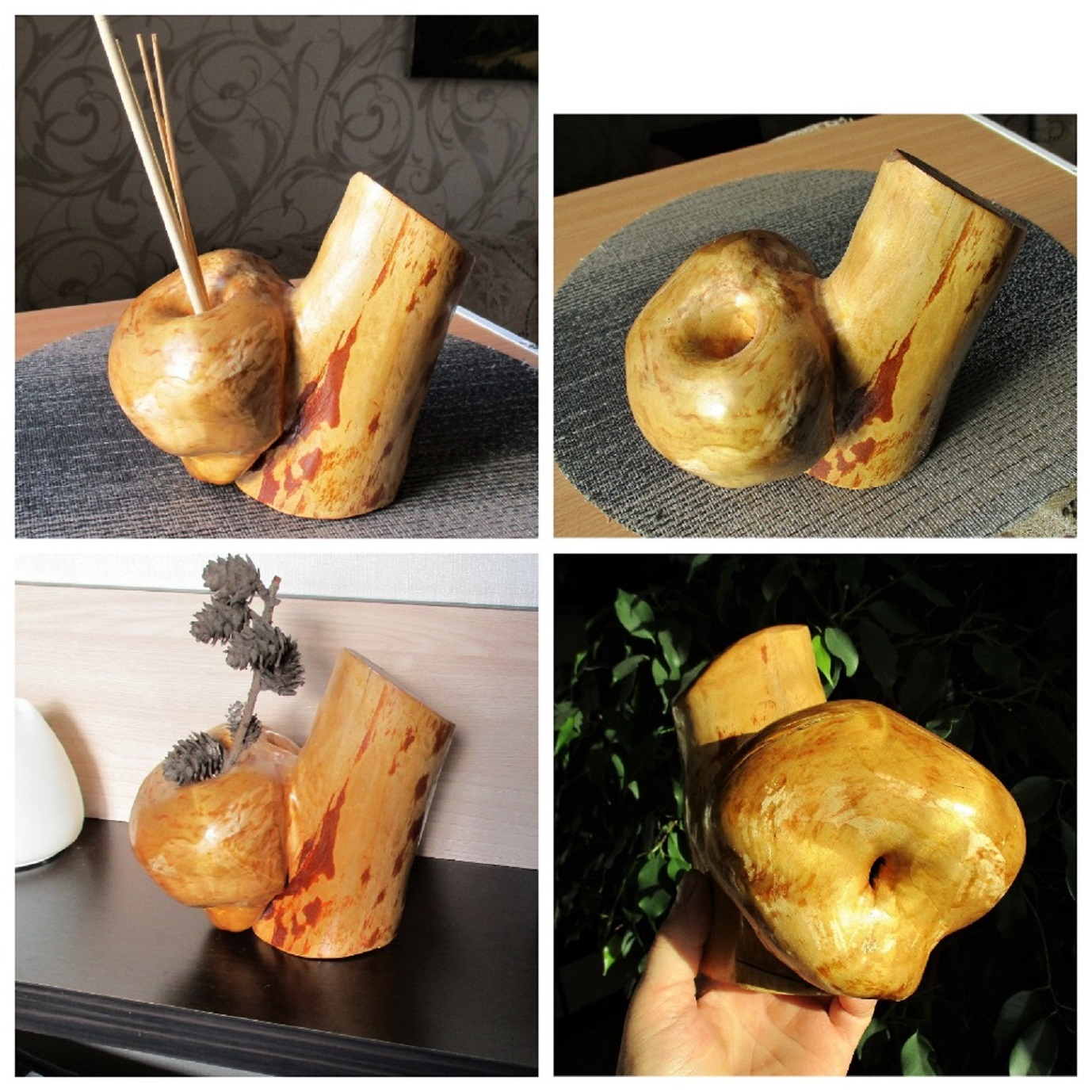 Как то, собирая грибы я увидел необычный нарост на березе. Формой он напоминал баранку. Следующий раз я взял с собой ножовку. Срезал «баранку» снял кору и залил углубление подкрашенной эпоксидкой. Получилась интересная подставка под небольшую безделушку. Я остался доволен ).