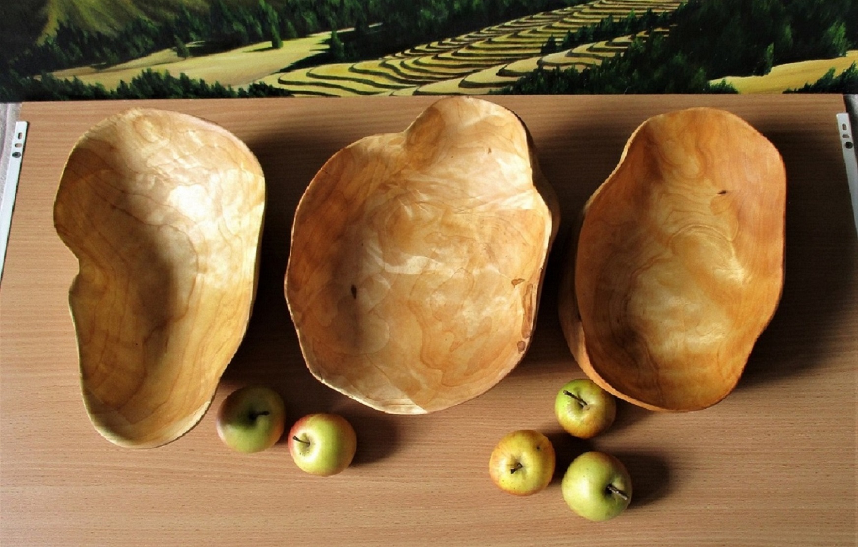 Пару раз попадался сувель клена. Но при обработке особо не впечатлил. Хотя определенное разнообразие получилось. Но вот в прошедшем году попался еще один кленовый сувель. Из которого получилось аж три блюда. При окончательной шлифовке поверхность просто засияла. Клены бывают разных видов. Видимо мне попался тот что надо.