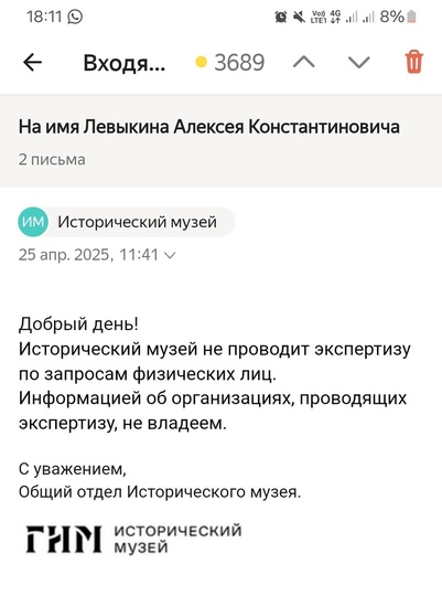 QUOTE(ДмитрийСавельев @ Apr 25 2025, 18:03) Подскажите тогда, пожалуйста, где можно одновременно провести спектральный анализ металла, подтвердить историческую подлинность и атрибутировать змеевик? В ГИМе нам отказали (скрин прилагаю). Если взять и просто сделать анализ металла, то потом скажут, что сомневаются в подлинности... Правильно написано: "ГИМ не проводит экспертизу по запросу частных лиц". Для этого есть околомузейные конторы, типа "Друзья ГИМа". Но они выдают такую нечеловеческую туфту в качестве атрибуции, что стыдно смотреть. Поэтому пока у Вас ГИМ не купил предмет — он не будет считаться ГИМом подлинным. Попробуйте ещё в ЦМиАР, но там, думаю, картина будет той же. А главное: никому из интересантов в лоб не упёрлось заключение "Друзей ГИМа" или даже самого ГИМа, т. к. им интересен предмет, а не бумажка. Спектралку могут сделать на богатой металлоприёмке, если у Вас в окрестностях такая есть (просто прозвоните окрестные номера), ну и в приличном ломбарде. 500 рублей. -------------------- Лучше обнаружить в яблоке червяка, чем его половину...