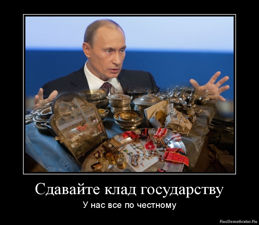 QUOTE(Пермяк @ Apr 4 2012, 11:39) Есть мнение что это специальный финт для того чтоб никому ничего не платить,сумма то баснословная! Чего думаете двум тастам будут платитьь мульены долларов? Так это и понятно.Хер когда,кому-нибудь заплатят за находки. Сразу пропадает все желание сдавать кладухи гос-ву -------------------- Горе земле, в которой подчинённые, начальники и суды, а не законы управляют гражданами и делами.(с)