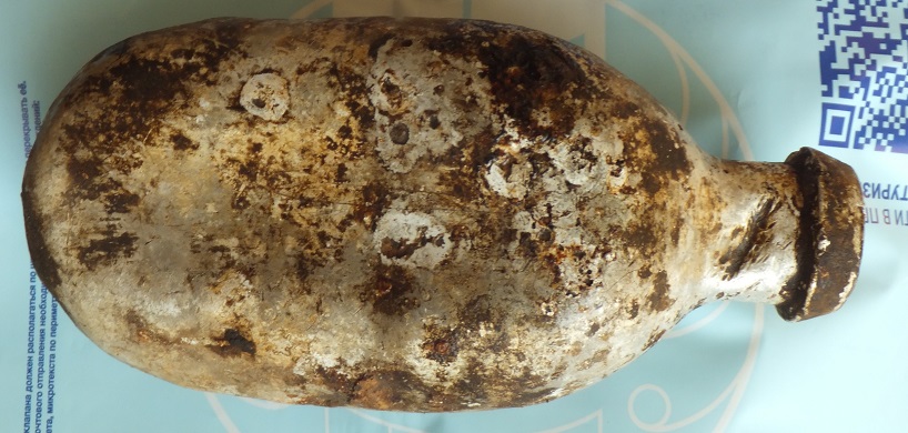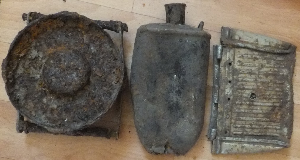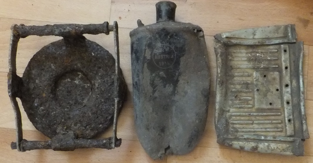 В центре австрийская фляга на перв мировую, справа обойма для немецкого противотанкового ружья, слева переноска вроде от артиллерийского снаряда или гильзы. С уважением!