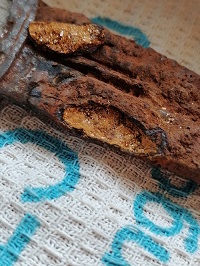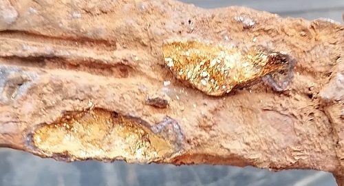 Здравствуйте! Имеется такой акинак. Начал чистить механически и с рукоятки отвалился кусочек ржавщины, образовалась интересная картинка. Смотрим фото. На форуме Химиков подсказали что это Пирит (дисульфид железа, FeS2). По внешнему виду и блеску он напоминает золото. Может образоваться при длительном контакте соединений железа(II) с органическими остатками без доступа воздуха. Меч мог находиться рядом с телом/в теле хозяина или его жертвы. Это называется псевдоморфизм. Получается, если это действительно так, то на рукоятке были какие то органические остатки человека, которые со временем были замещены минералом. Небольшие кристаллики , напоминающие слюду, только желтого золотого цвета находились внутри ржавого образования, которое было полым, часть из них прилипает к стенкам, на фото видно. Возможно данным псевдоморфозным образованием, что является очень редким явлением, покрыты еще участки на мече. Вот что теперь дальше делать? Химики молчат. Может кто встречался с данным явлением и что посоветует?