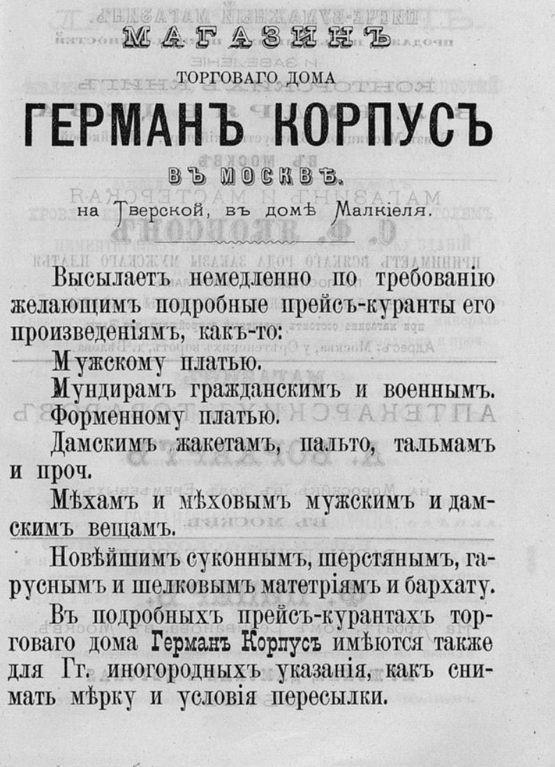 Пуговицу заказывал для своего бизнеса Герман Корпус, владелец магазина готового платья, распологавшегося на углу Малой Морскй и Невского проспекта.