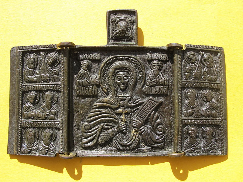 16 Складень Богоматерь Знамение - Митрополит Петр, Святитель Николай Чудотворец, и Никита воин. Штивт и петли родные , без ремонта. Размер в раскрытом состоянии 39х62 мм