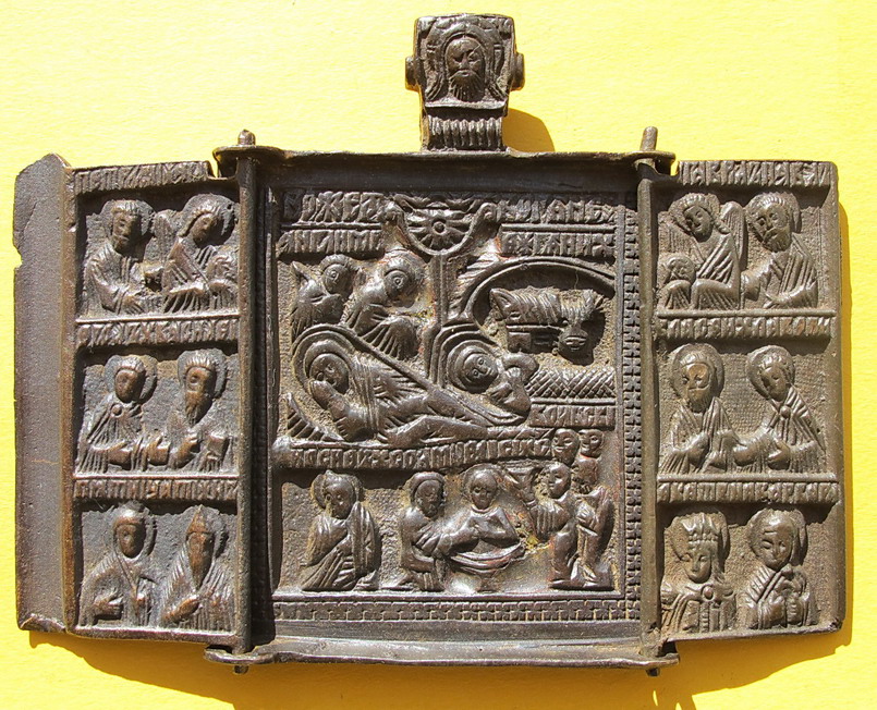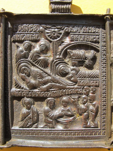 18. Складень Рождество Христово. Остатки красной, желтой и прозрачной эмали. Скорее всего ранний Выг. Размер в раскрытом виде 76х97мм