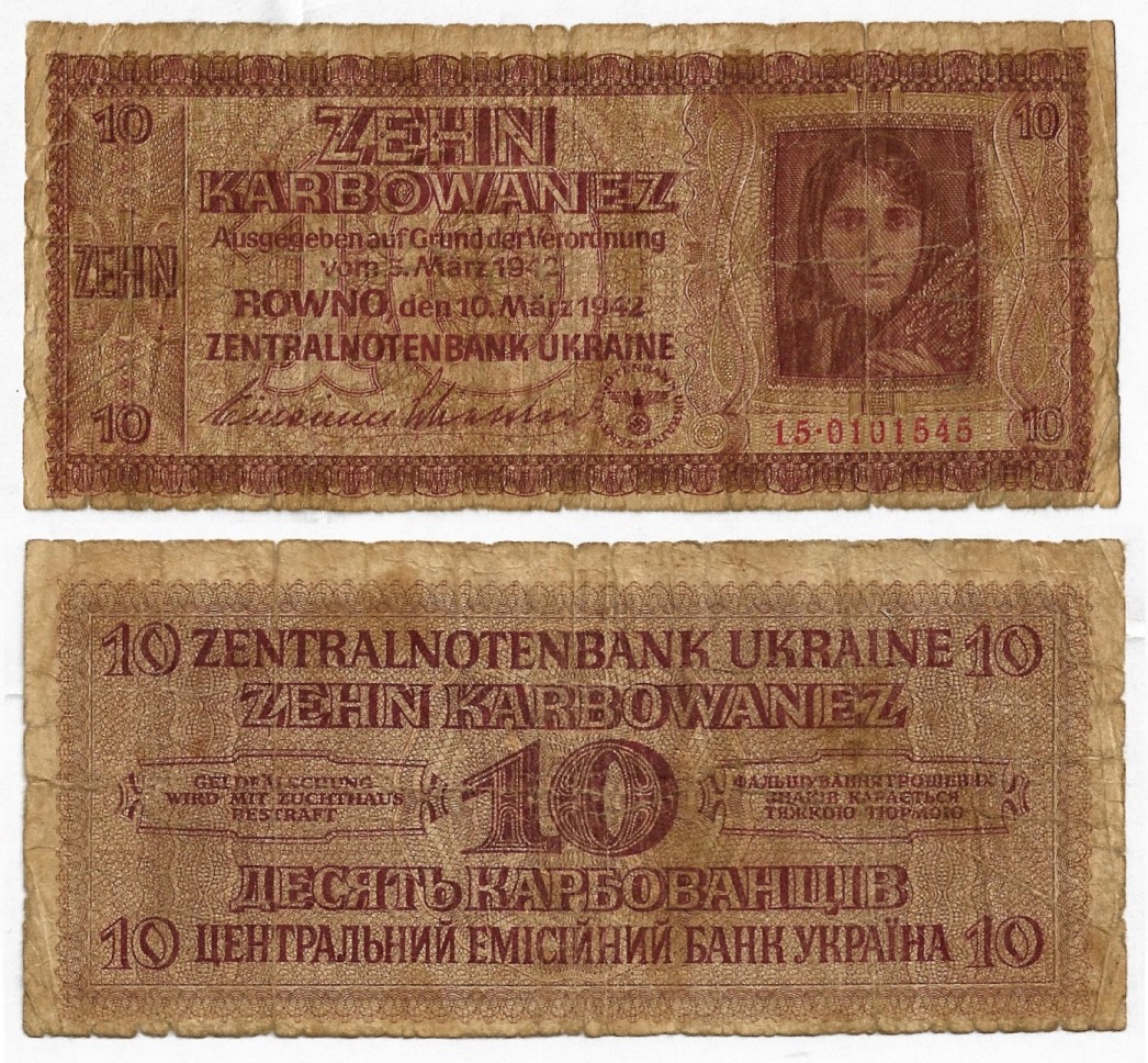 10 карбованцев Германская оккупация Советской Украины. Вторая мировая война 1942, Ровно. Сохранность на фото.