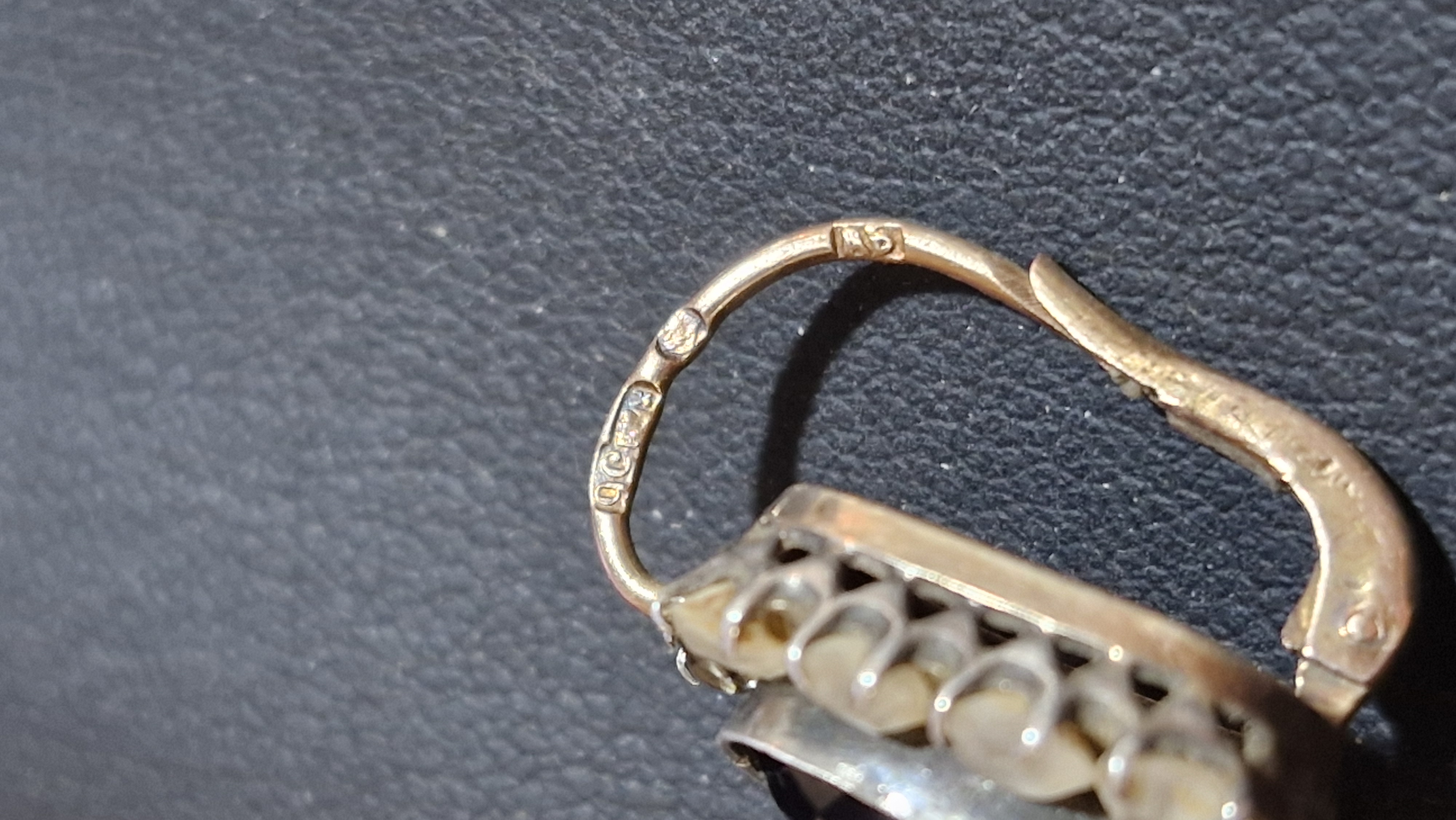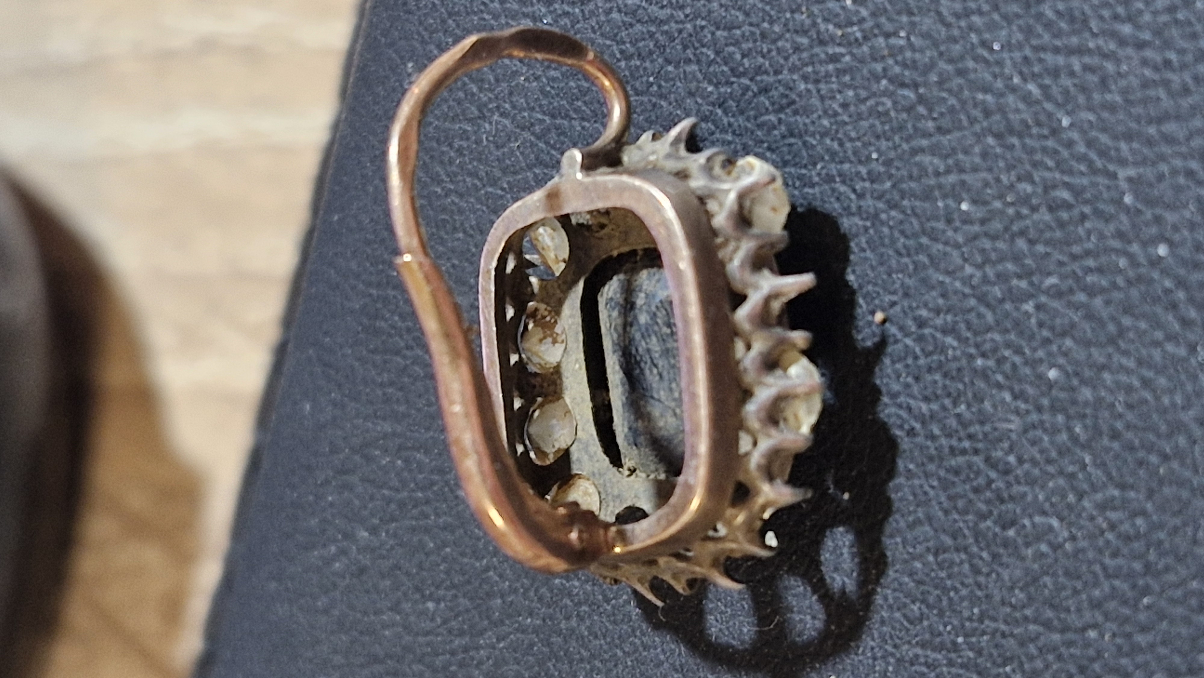 Подскажите пожалуйста по сережке. Стоит ли чего? Сохран на фото. Вес изделия со вставками 2,72 гр. Вставки скорее всего хрусталь или стекло. Верхняя часть изделия из белого металла. На йод не реагирует. Вложенные эскизы изображений -------------------- Если я выиграл Ваш лот, пожалуйста сообщите в личку. С уважением,