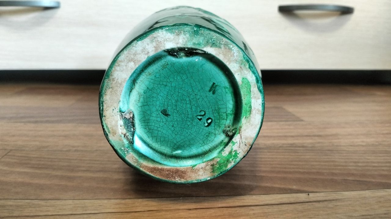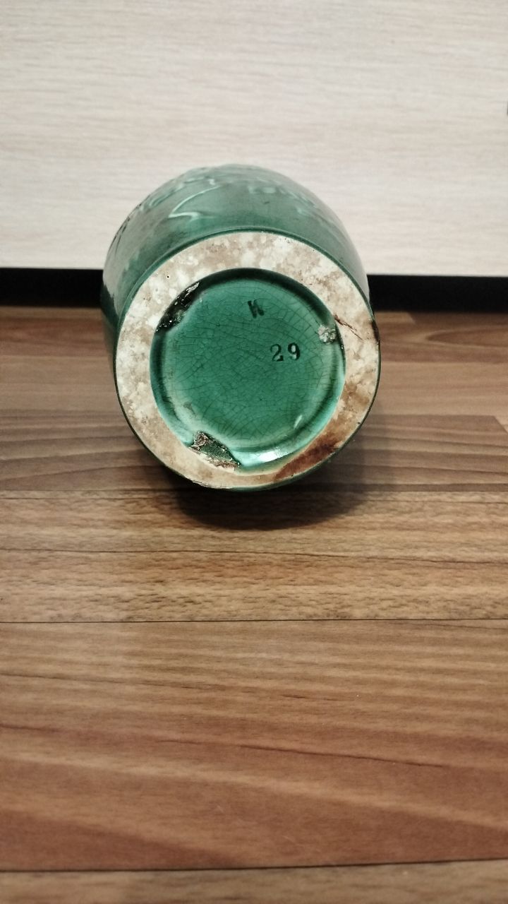 С большой вероятностью. Ваза, изумрудная поливная глазурь. Тверской фабрики «Товарищества производства фарфоровых, фаянсовых и майоликовых изделий М. С. Кузнецова». Буква «К»: Это сокращенное обозначение завода-изготовителя. Число «29»: Это номер модели (фасона) изделия в заводском каталоге или номер формы для отливки.