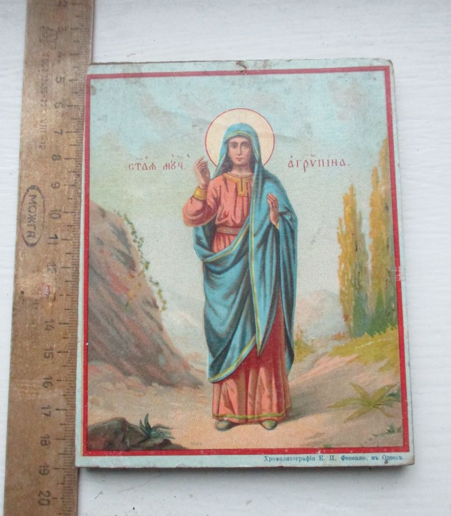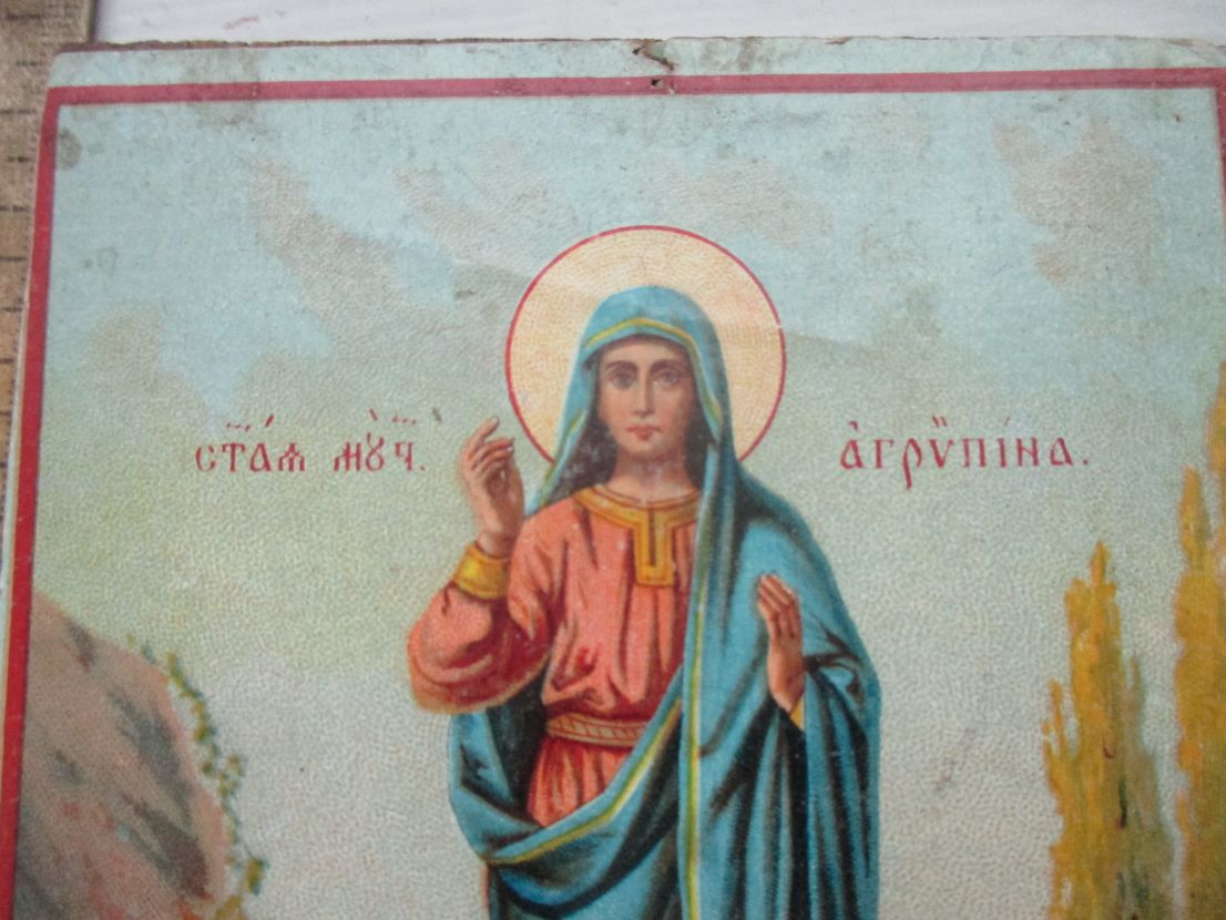 Икона Святая Мученица Агрипина (Хромолитография на дереве, дореволюционная).