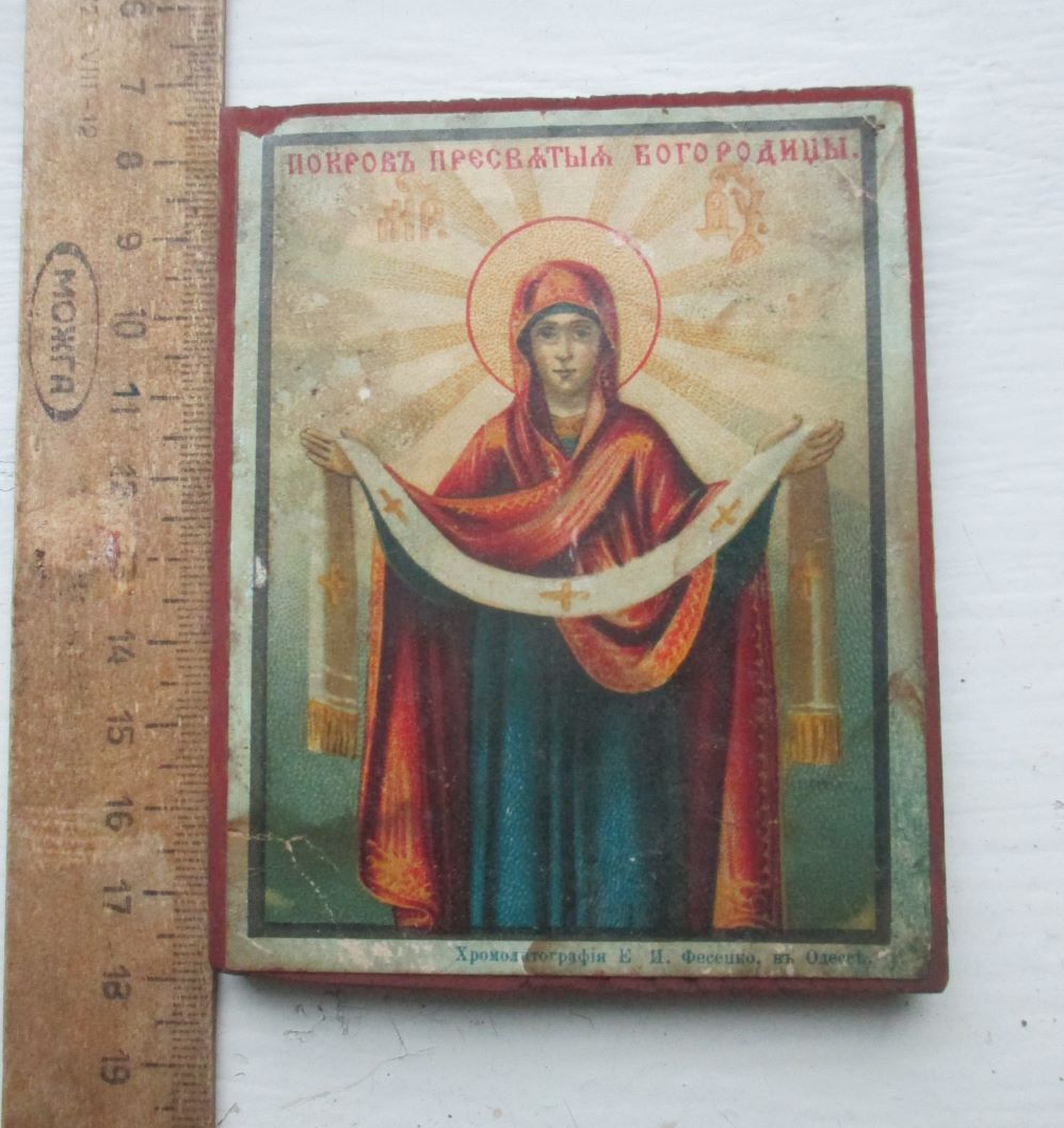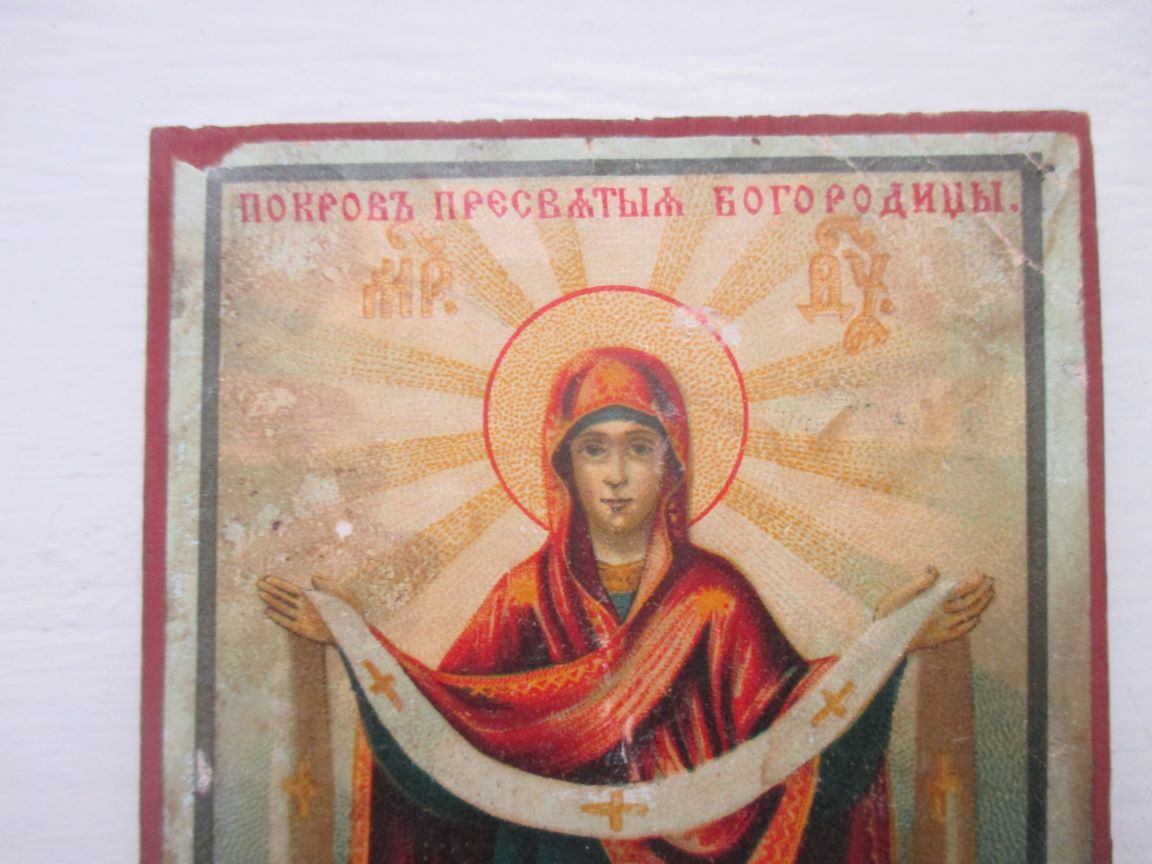 Икона Покров Пресвятой Богородицы (Хромолитография на дереве, дореволюционная).