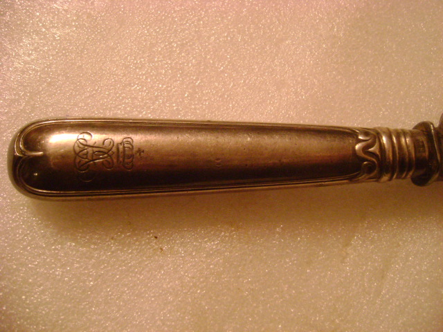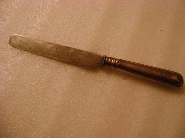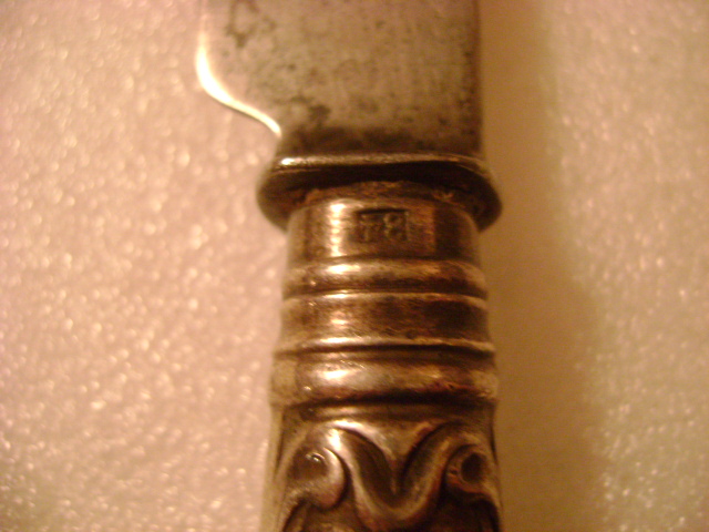 большой столовый нож периода РИ,ручка серебро 84 пробы,лезвие качественная сталь,длина- 27см,общий вес- 147 грамм,чистого серебра в ручке( без песка,канифоли и прочего) более 60 грамм! на ручке дворянская корона!