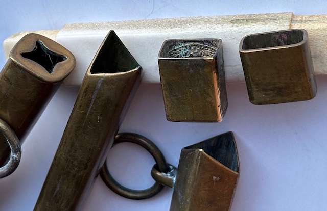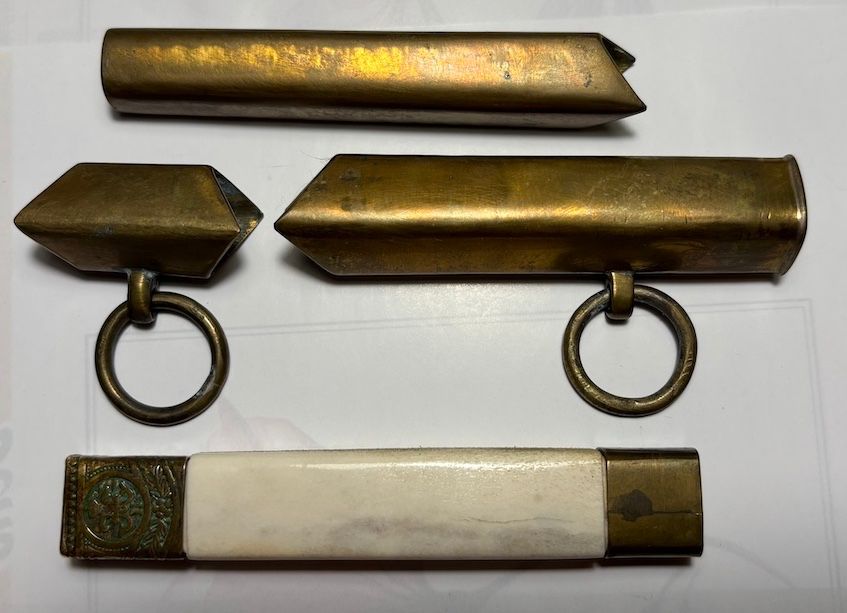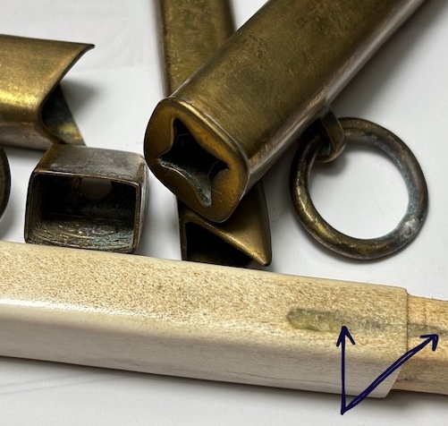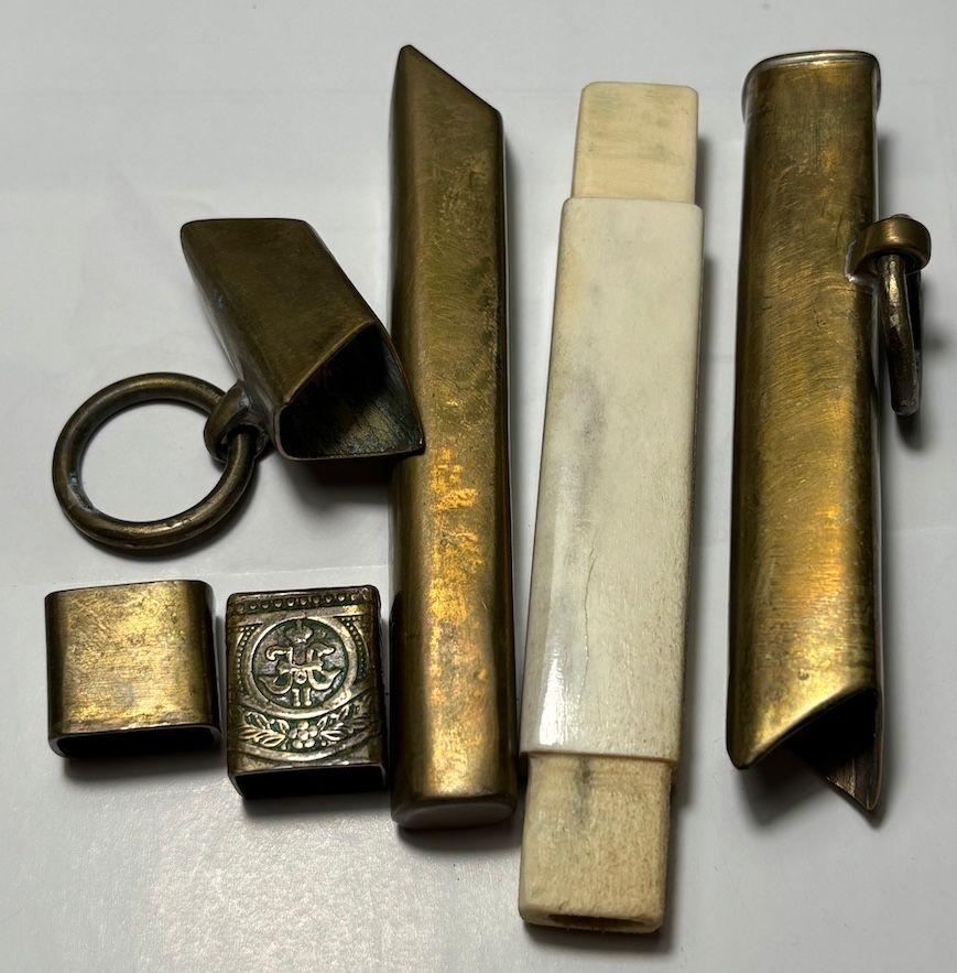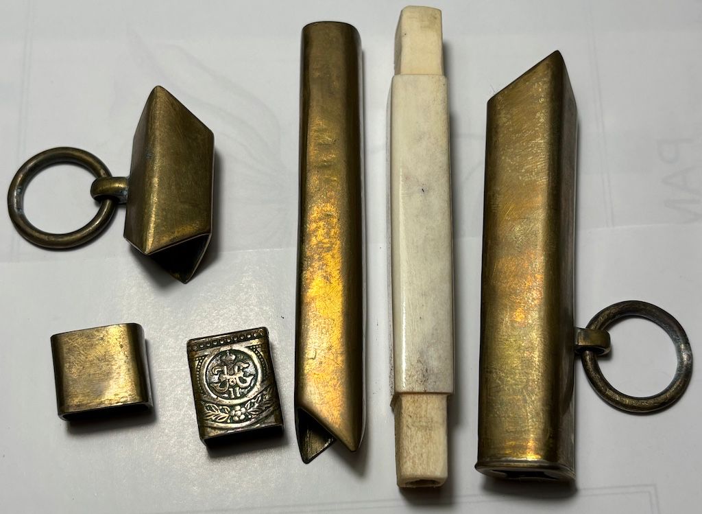 Набор латуни на кортик, навершие с контеррельефом. По оригинальности не скажу, но хороший, крепкий.Черен кость, с дефектом, указал.Идет бонусом.Что за кость не знаю, не слон точно.