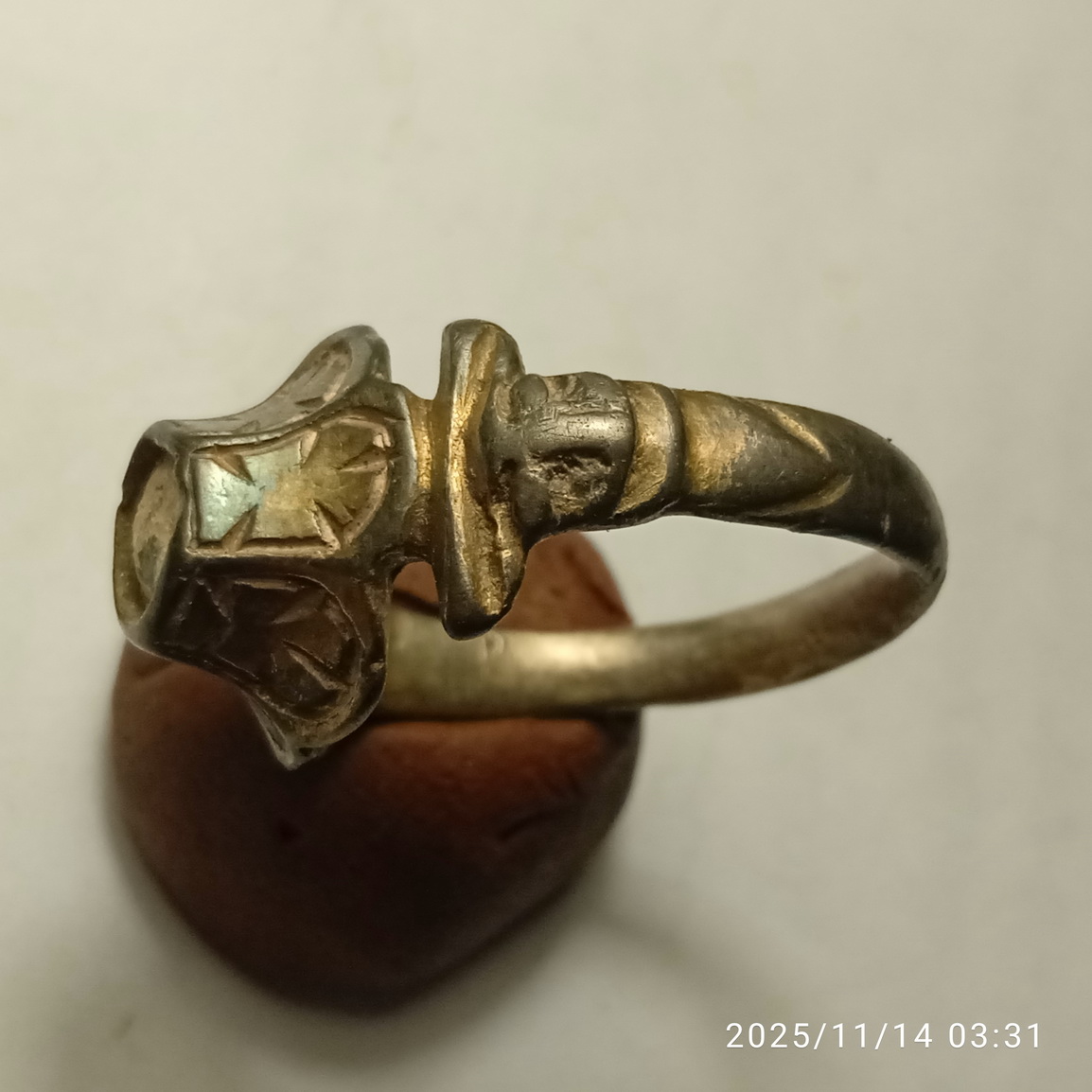 Прошу помочь с определением , и ориентировочной оценкой данного перстня. Найден в Нижегородской области. Вес 6 грамм , присутствует позолота. Клейм нет. По сопутке сложно судить ... находки были разные ... С ув. Алексей. Сообщение отредактировано рональдин: Вчера, 09:40 Вложенные эскизы изображений -------------------- Куплю различную копанину.