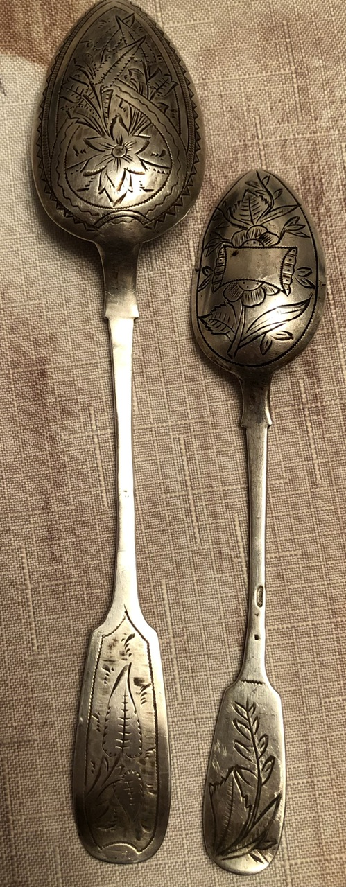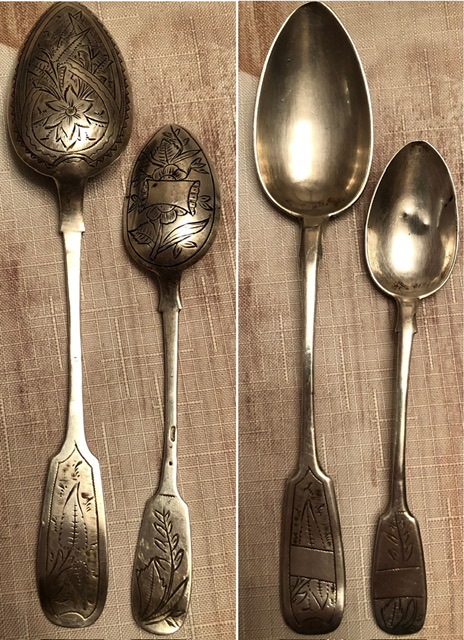2 ложки. Размеры 18см. 14 см. Вес общий 54.8 гр. большая ложка 35.3гр. Маленькая 19.5 гр. проба на маленькой 84. На большой нет.
