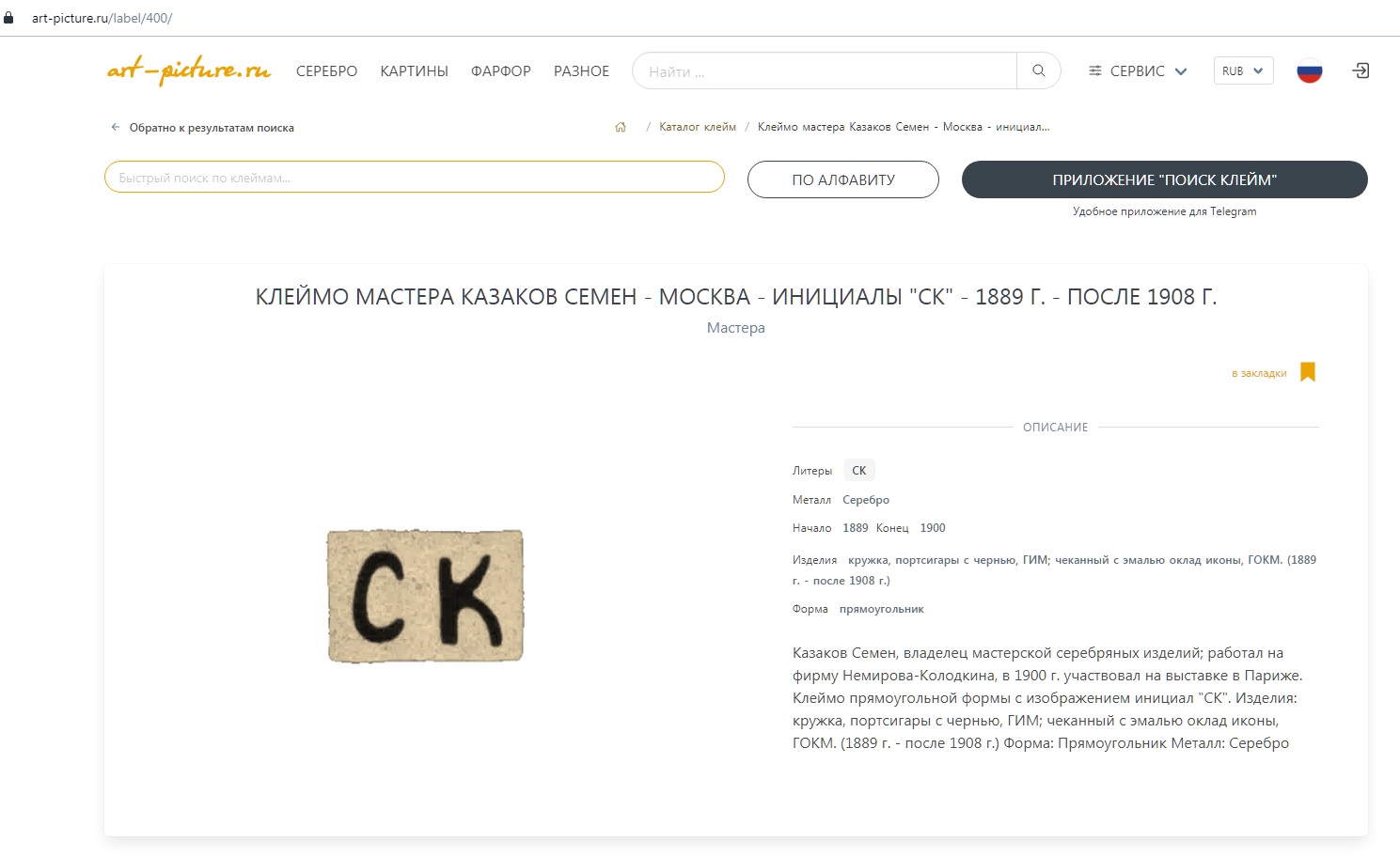 Попался в руки сей предмет. С детства его помню, но ничего про него не знаю. Лежала себе серебряная пластинка в бабушкиных платочках.... Пока готовил фото к данному посту, сам нарыл про него кое что, во всемирной паутине. На "пластинке" 2 клейма: - одно говорит, что изделие после 1907г. Москва серебро 84 пробы. - второе, "СК" - Мастер Казаков Семён - выставлялся даже в Париже в 1900. Вес 38 гр., размер 100*55 мм. Вопросы: Что это за предмет? И имеет он какую либо ценность, кроме цены за лом? Вложенные эскизы изображений |