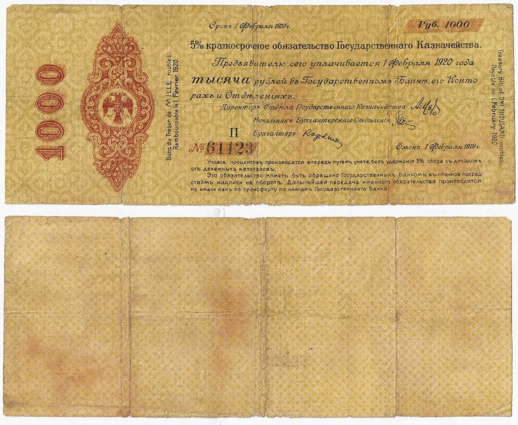 Колчак, 5% Краткосрочные Обязательства Государственного Казначейства. 1000 рублей. 1919 год, Сохранность на фото.
