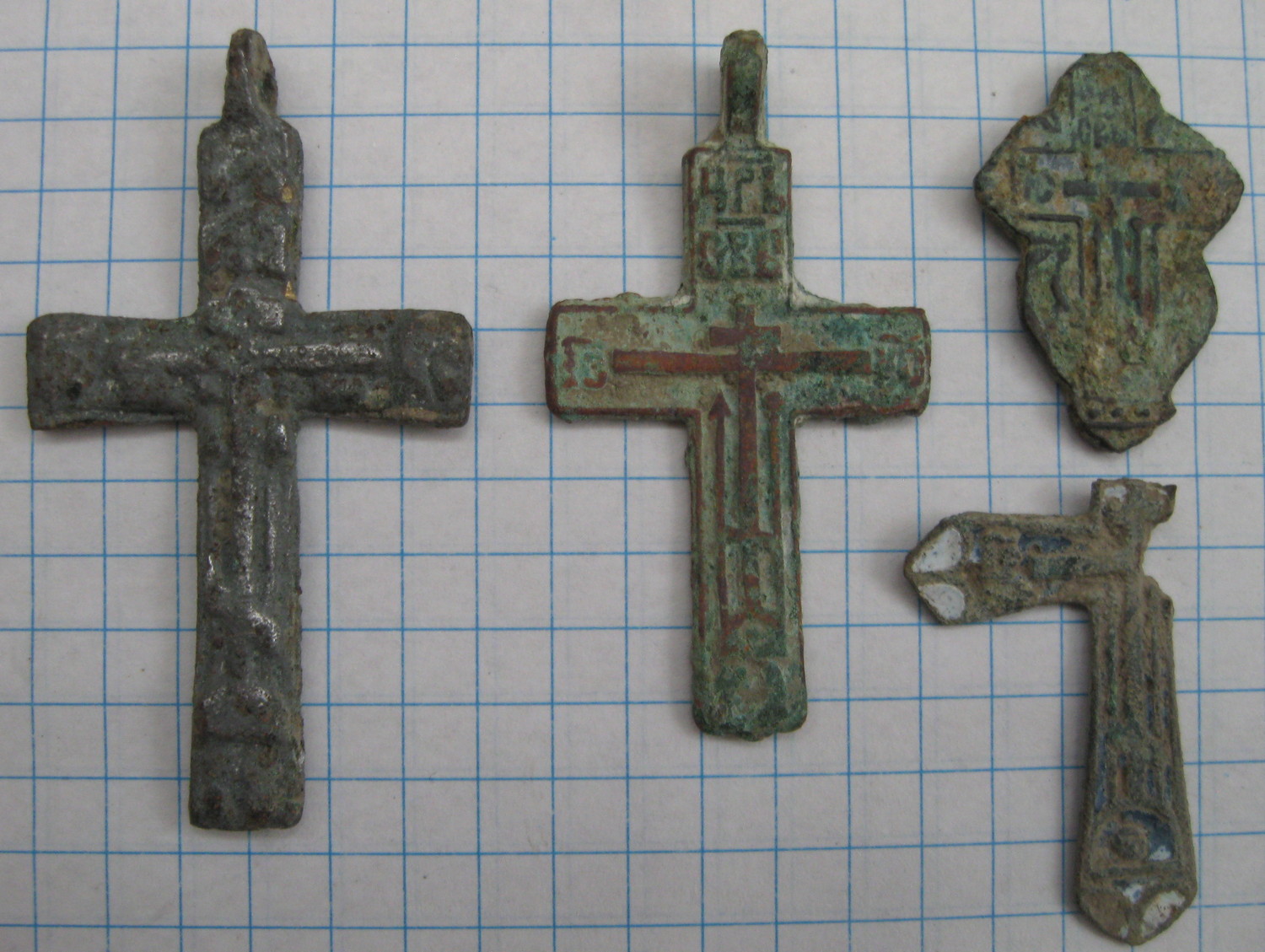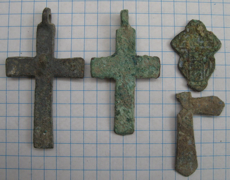 Здравствуйте, Господа! Подскажите,пожалуйста,какого времени эти кресты? и будет ли интерес на Ауке ? Самый большой крест (слева) похоже,низкопробное серебро с остатком позолоты. Остальные - бронза. Обломок - с остатками эмали. Найдены в одном месте. Помыты в теплой воде. Заранее благодарен и с Уважением - Аленус.