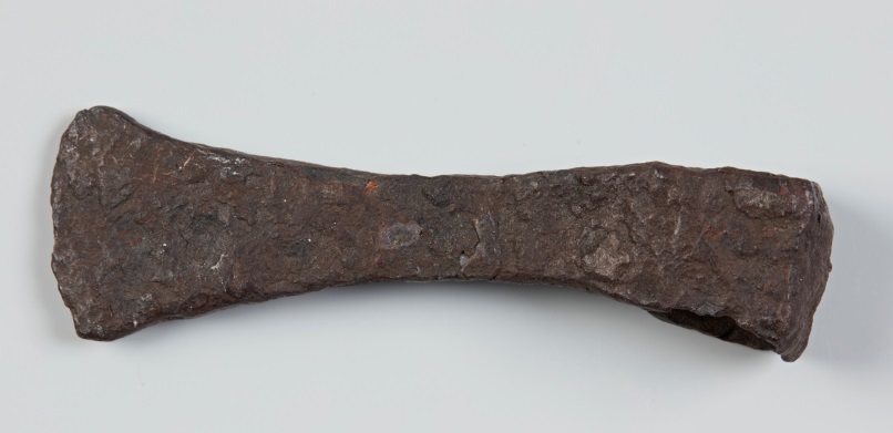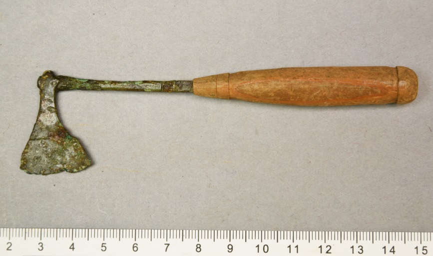 Если немного отойти в сторону то возможно может ещё что-то подсказать вот данный топорик с сохранившейся ручкой (эпохи викингов), да он не железный, но на более позднюю эпоху есть похожие по форме черешковые топорики из железа которые вероятно так же могли вбиваться в деревянную ручку. В 19-20вв были похожие по исполнению небольшие топорики для колки сахара, но тут понятно речь о сахаре не идёт. Правда на данный конкретный топорик тоже нет однозначной трактовки, он был положен в захоронение к женщине, в основном пытаются трактовать как нечто символическое Вложенные эскизы изображений |