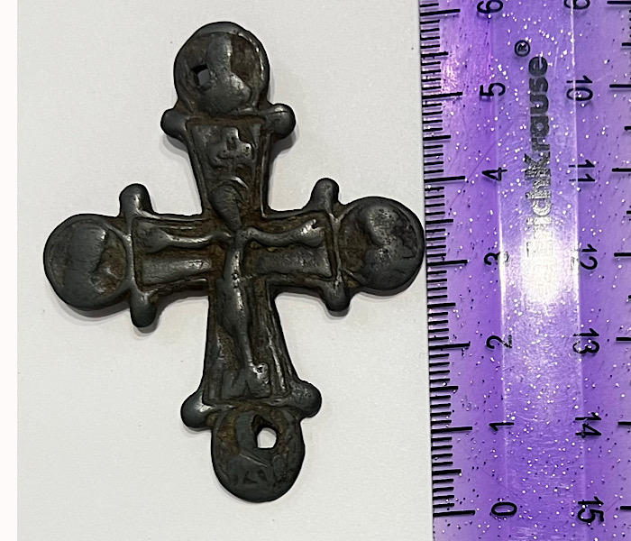 Добрый вечер, уважаемые участники форума. Прошу Вас помочь с датировкой и оценкой данного крестика. Находка - Брянская область, размеры 4,5 см. на 5,5 см.. В каталоге " Меднолит " определяется как накладной крест, переливок с энколпиона 12-13 века, степень редкости R9. А также, хотелось бы у Вас узнать, будет ли интерес на аукционе.