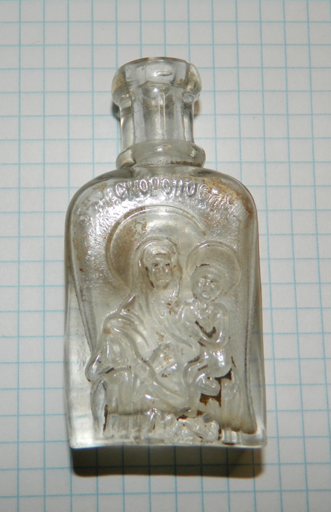 Церковный флакон. С двух сторон лики святых - с одной стороны Б.М. Скорорпослушняя с другой , святой Пантелеймон.