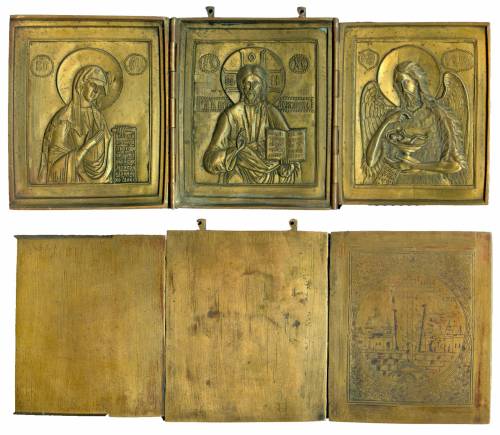 Еще раз прошу посмотреть на сходство представленных мною икон-форму литья,изъяны ,размеры и пр.,абсолютно одинаковы. Единственное на что я могу согласится-это на то, хотели сделать створку ,но оставили иконой. Да к тому же эта икона была найдена в старом монастыре. У меня есть фото идентичных по внешнему виду складней,но их размеры разнятся с представленной,а вот фото иконы из меднолита и моя-одно и тоже(размеры и все остальное). |