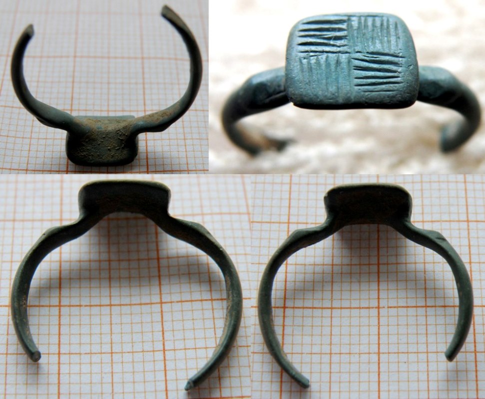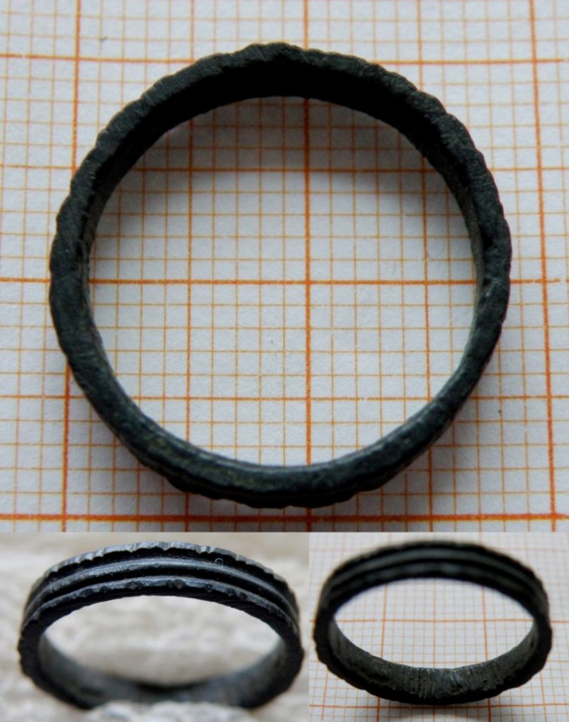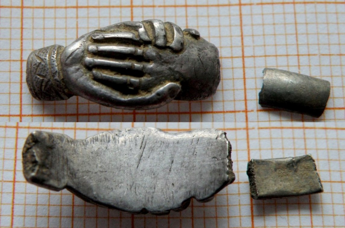 Здравствуйте! Предлагаю вашему вниманию пару интересных обломков перстней. С ладошками, в серебре. "Размежёваное поле" из бронзы. Колечко найдено на вятичах, в верховье р.Оки.