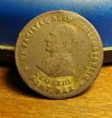 Юбилейный медальон, вручаемый в связи с юбилеем Папы Римского Льва 13 (период понтификата (1878-1903). Диаметр медальона 2.4см. На лицевой стороне изображен профиль лица Папы Римского Льва 13, а так же имеются надписи следующего содержания «Leo XIII Pont Max». По окружности медальона так же имеются надписи «Na Pamitke Roku Jubileu szowego». На оборотной стороне медальона имеется рисунок в виде круга с крестом внутри. В центре креста имеется надпись «Kcrristys Deus».