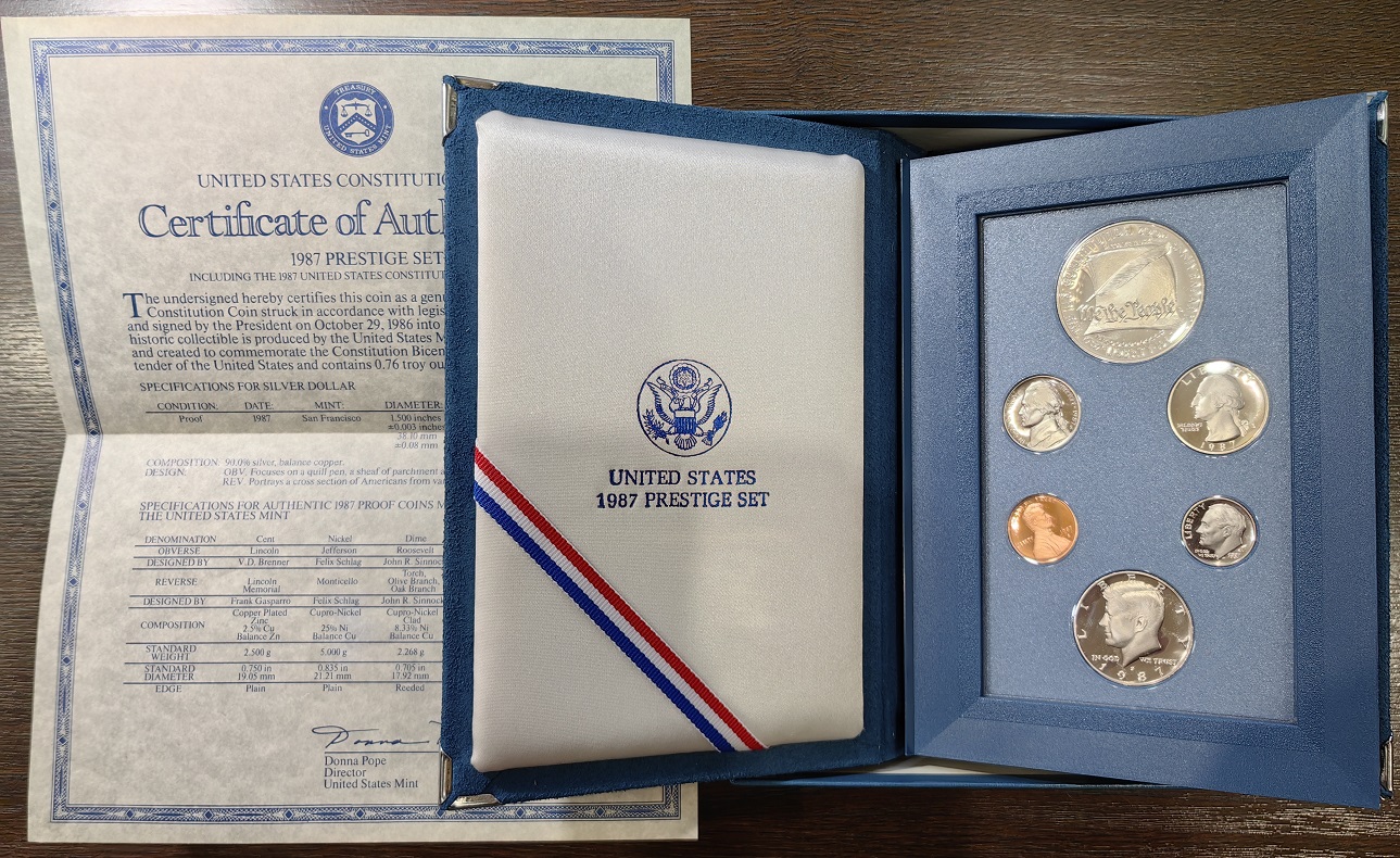 Монетный двор США 1987 года. Престижный набор монет Конституции США, в который входят в общей сложности 6 пробных монет.
