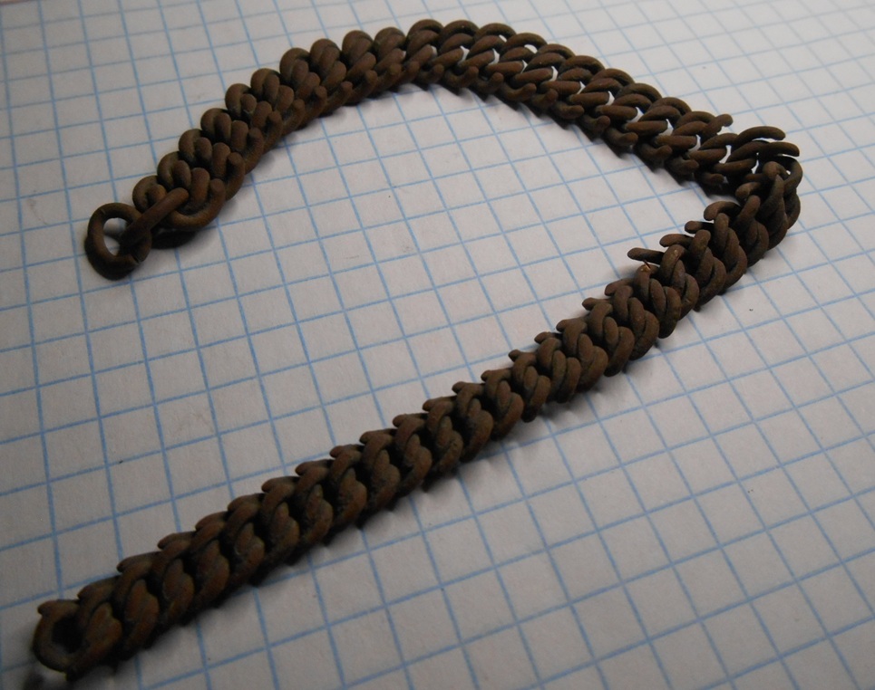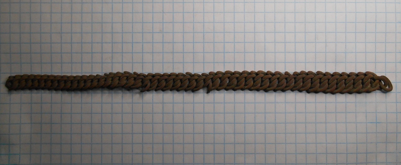 Всем приветствие. Подскажите пожалуйста по данной цепочке. Цепочка с одного края к другому сужается, имеет на одном конце кольцо для крепления к ним чего-то, материал - медь, сложное плетение. Из сопутки, на этом поле, много монет ЦР, гусарская пуговица, погонный вензель и др. пуговицы. Длина 188 мм. На церочку от часов не похожа.