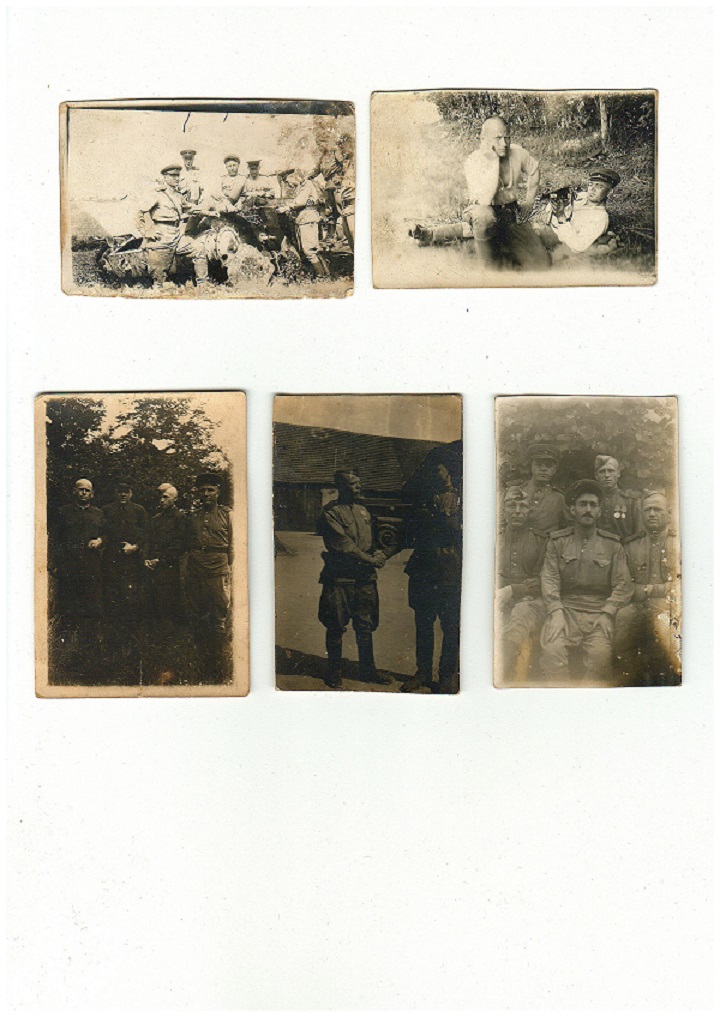 5 старых фотографий , 4 шт примерно 5.5*8.5 и одна 6*9, на одной есть надпись "семьск - в австрий 8./6 45 на охоте", пунктуация и орфография аутентичная как на фото. Т. к. фото были в копии Свидетельства о рождении (отдам бонусом), один человек определен, есть ФИО , г.р., адрес призыва РВК, номер войсковой части.