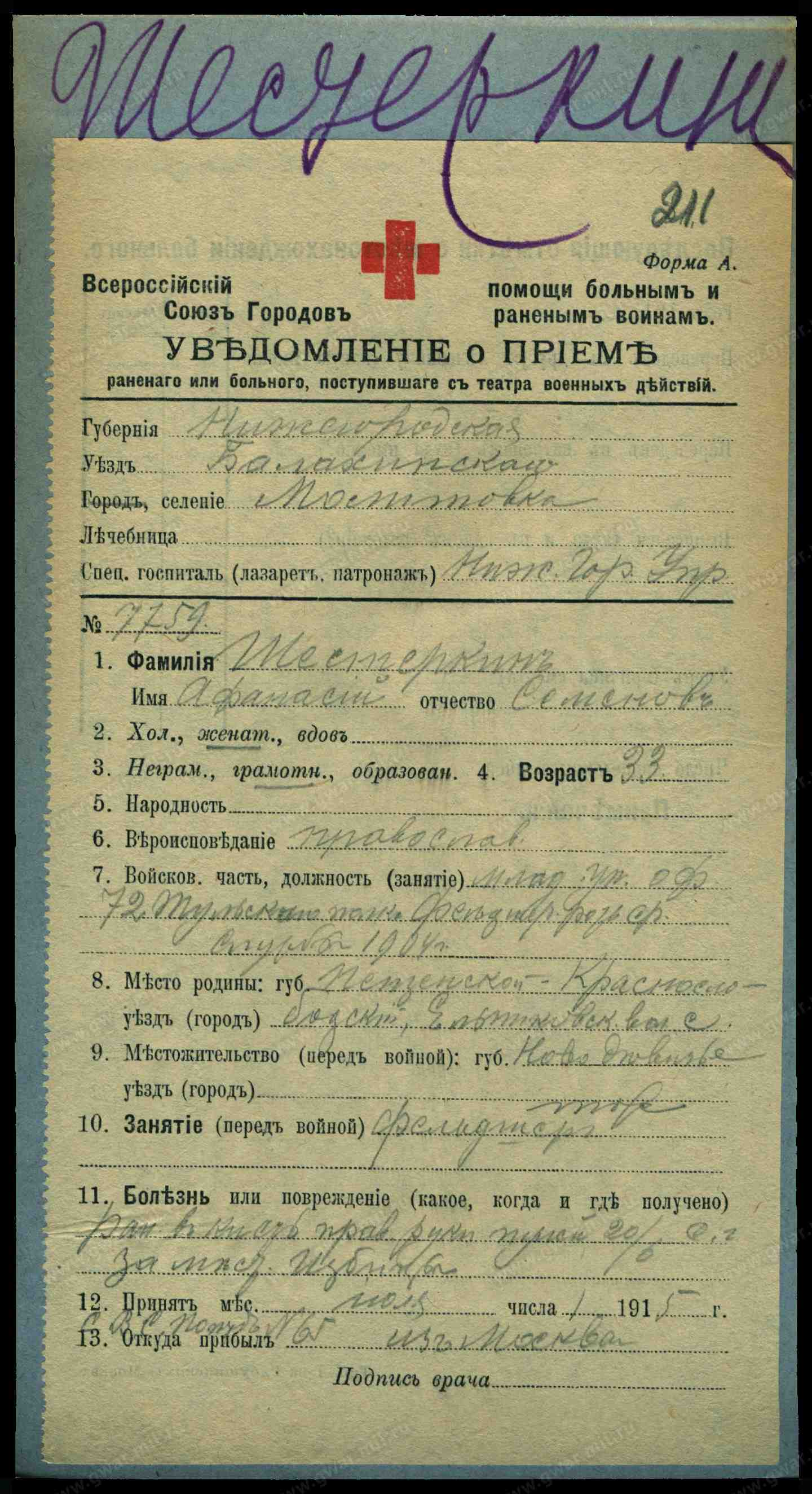 Здравствуйте коллеги. Столкнулся с такой дилемой. Товарищь попросил уточнить награждение ГК сам он с сетью не очень. Я пробил по С. Б. Патрикееву, вроде все нормально, определяется .Решил кавалера пробить на "Памяти героев великой войны" и тут немного данные стали расходиться со "сборником кавалеров ГК".Вот собственно кавалер ГК 4ст 207118 Шестеркин Афанасий Семенович-72 пех. Тульский полк фельдфебель. За то что в бою19. 05.1915 при взятии занятого неприятелем укрепленного пункта, ободрил своих подчиненных и увлек их за собой. Прилагаю карточки о ранении, где он указан как фельдшер мл. ун-оф. через месяц после события за которое был награжден. Вопрос в следующем. 1.Неправильное прочтение при составлении сборника, возможно было сокращение фельд. Которое автор прочел как фельдфебель, а надо было как фельдшер? 2.Может его наградили за это дело гораздо позже когда он уже дослужился до фельдфебеля? Возможно у кого то есть приказ о этом награждении и его дата даст понять фельдфебель или фельдшер.Заранее спасибо.
