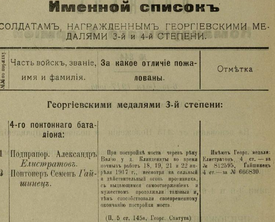 QUOTE(Рияд @ Jan 4 2026, 21:47) Помогу ! На праздник надо делать подарки! ГМ 4ст № 666830 Гайшинец Семен – понтонер 4-го понтонного батальона. Имеет ГМ 3ст. Приказ Командующего 10-й Армией Приказы о награждении, №: 844, 06.07.1917 — 06.07.1917, 10-я Армия, генерал-лейтенант Ломновский Приложу копию документа подтверждающее награждение 4ст. Благодарю !!! |