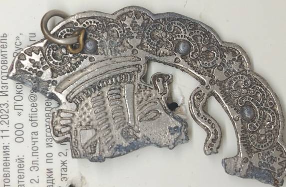 Вот такое изделие. Похоже отломанная половинка. Похоже на серебро, на бумаге чертит. Проба если и была ,осталась на отломанной части.Размер обломка крупненький, где то 30*60мм вес 17 грамм. Что за изделие и серебро ли ?
