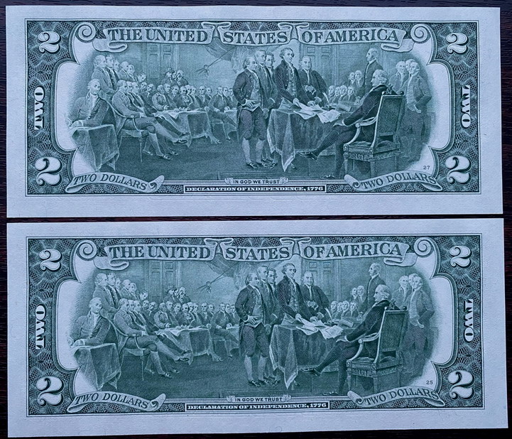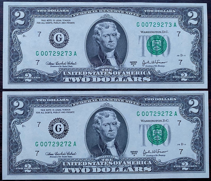 Предложу лот - 2 купюры по 2 доллара США 2003 А Номера подряд. Хруст-не сгибались из пачки. Состояние на фото. Любые фото по просьбе вышлю в личку.
