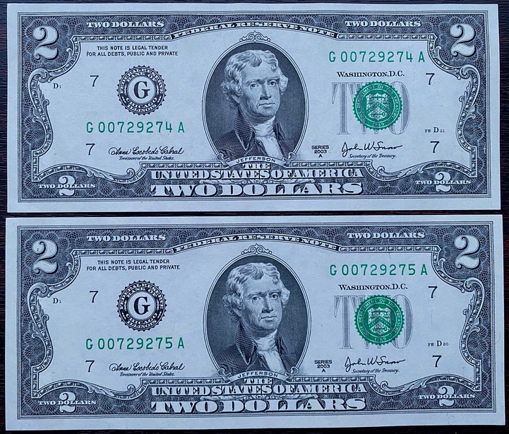 Предложу лот - 2 купюры по 2 доллара США 2003 А Номера подряд. Хруст-не сгибались из пачки. Состояние на фото. Любые фото по просьбе вышлю в личку.