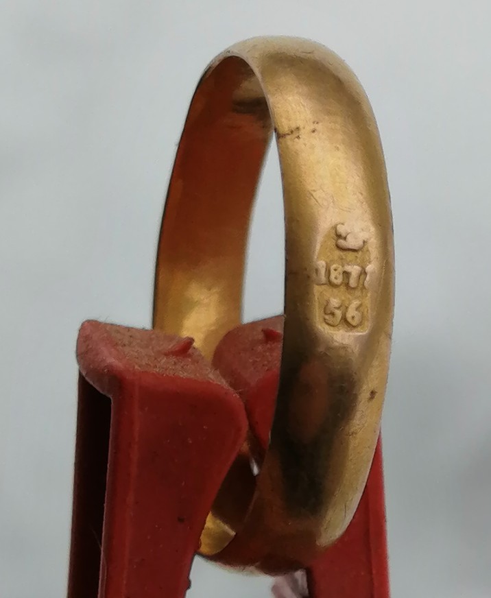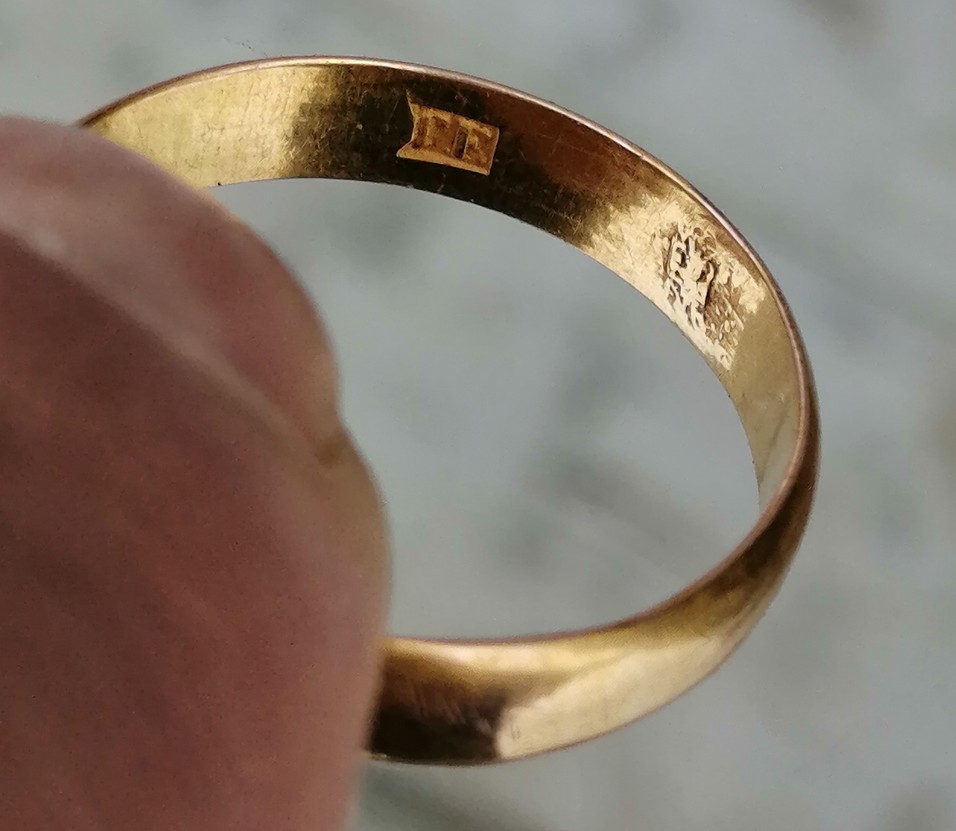 Уважаемые,приветствую всех.Может кто подскажет влияет ли на сегодняшний день клеймо-ГГ или ГЕ(поправьте),год выпуска 1871 на оценку этого кольца.Вес 2,95 г.Или как обычно,что ничего необычного-в лом?В интернете смотрел на других площадках попадаются подобные,ценник выше лома.Хотел услышать Ваше мнение.Найдено мною,лесной поиск,Владимирская область.И ещё вопрос-справа от клейма(внутренняя часть кольца) есть ещё какое то нанесение или что-то типа клейма(похоже чем то на корону.может ошибаюсь,поправьте.)Что это может быть?
