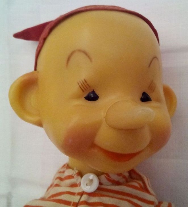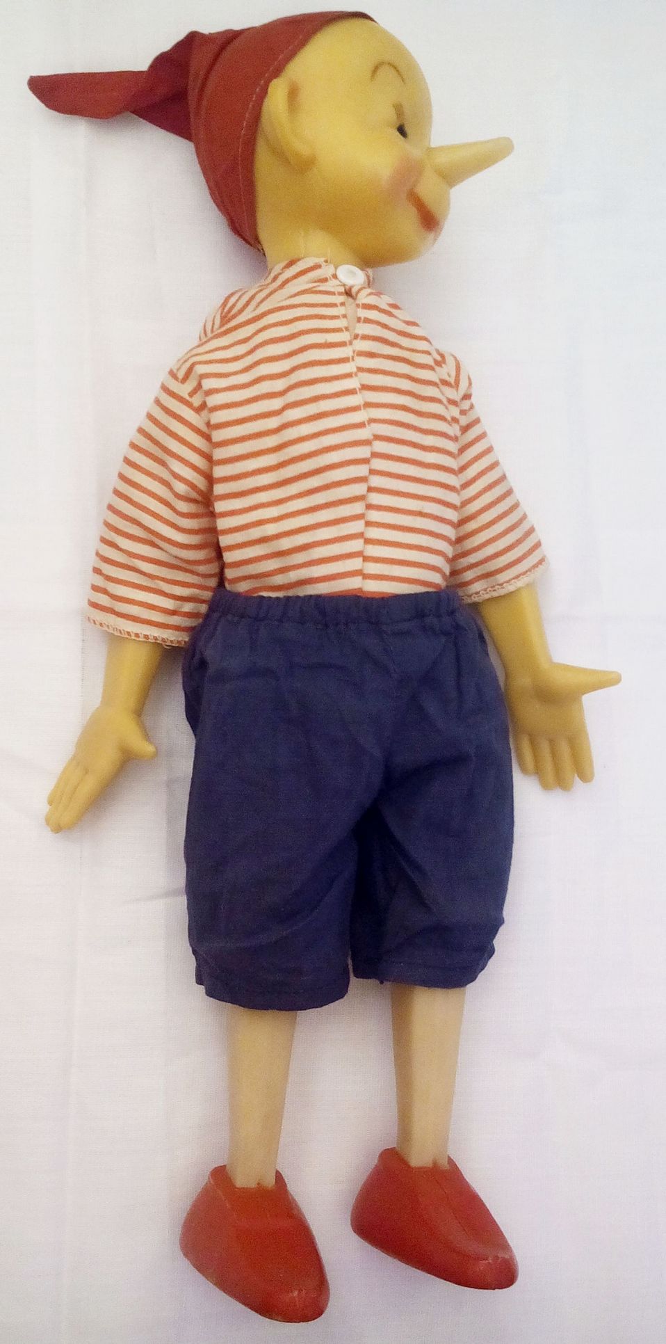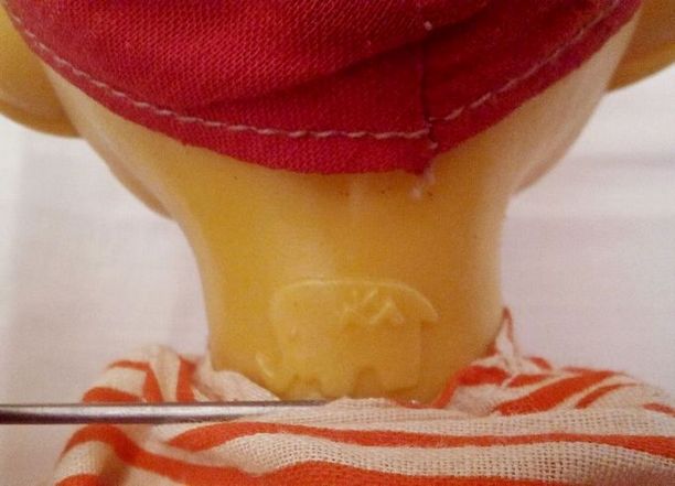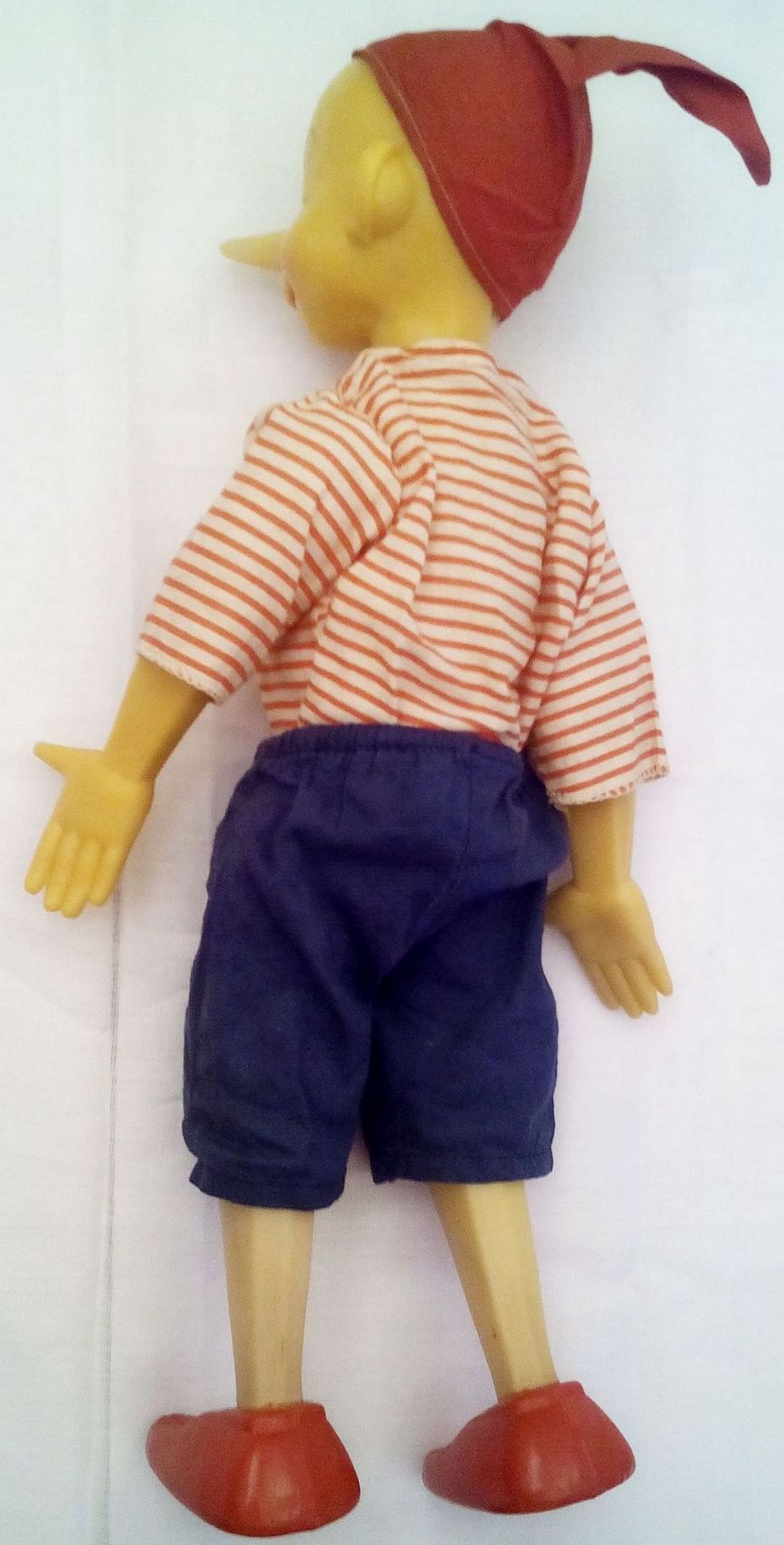 Кукла "Буратино" производства завода игрушек "Кругозор", СССР. Ранний выпуск. Голова, кисти и предплечья рук, колени и стопы ног изготовлены из пластмассы; туловище, плечи рук, бёдра - тканевые с мягкой набивкой. Рубашка на пуговице, штанишки на резинке, колпачок приклеен к голове. На задней поверхности шеи имеется знак предприятия-изготовителя (см. фото). Состояние новой. Каких-либо повреждений, загрязнений, трещин, разрывов и т.п. не обнаружил. Рост куклы - 40 см.