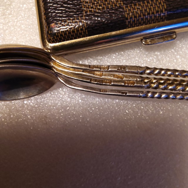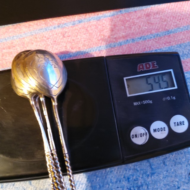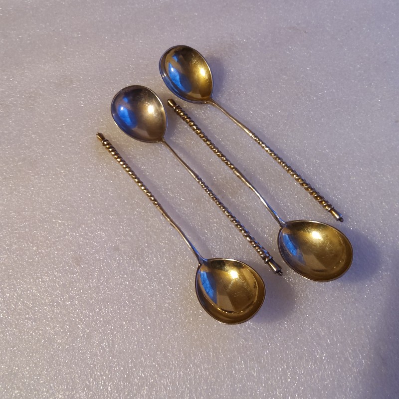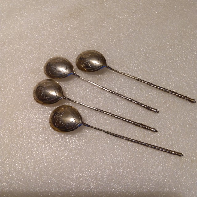 4 чайные ложки периода ри,серебро 84 пробыювитве ручки,позолота 1888год выпуска,общий вес-54,5 грамма